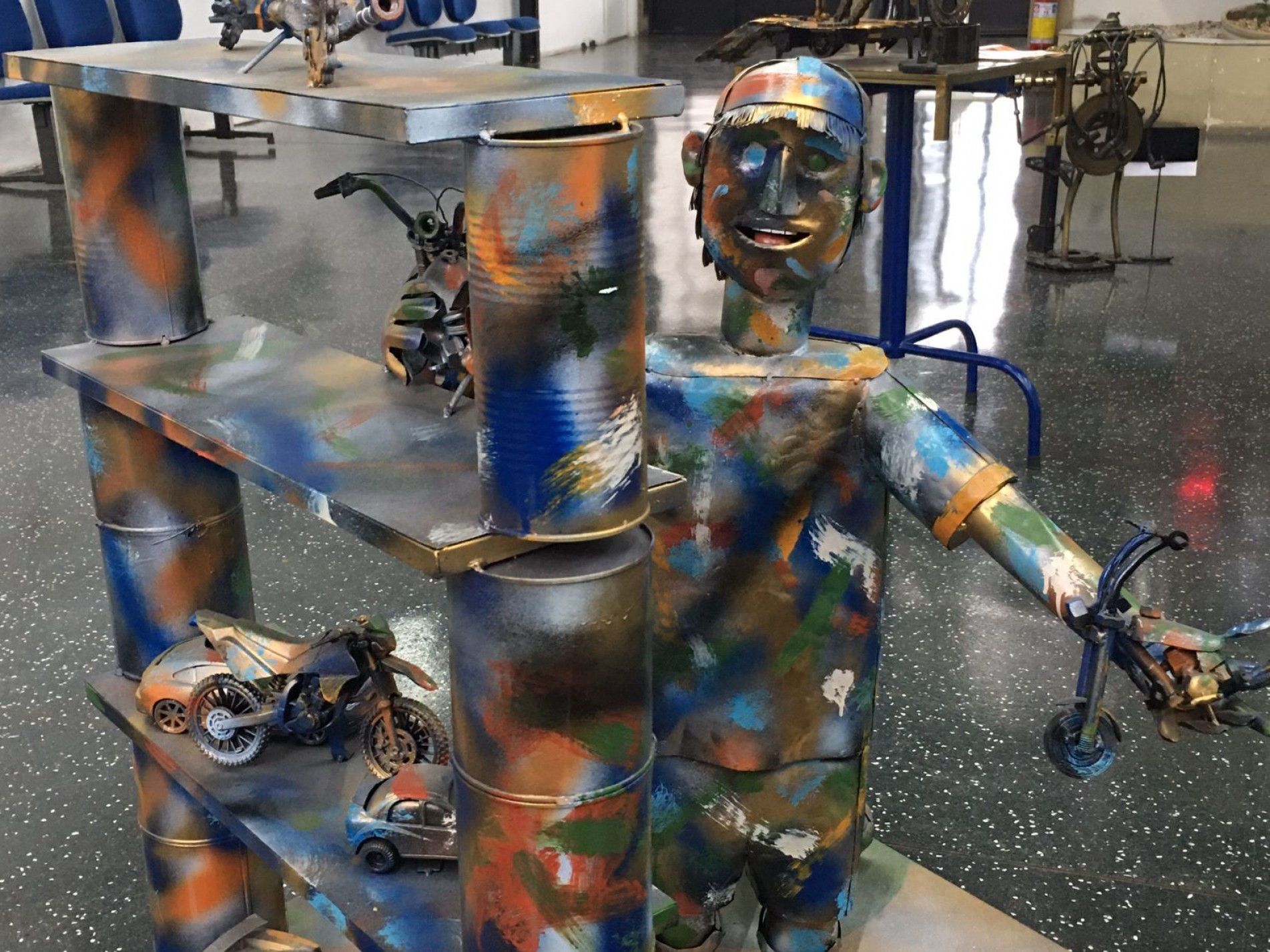 Entre as sucatas estão as peças inspiradas no dia a dia, como “O lúdico na infância”, em que ele viu seu filho brincando em um sítio e oficializou o momento com a arte. Outra peça interessante é a “Selfie”, presente na rotina de todos.