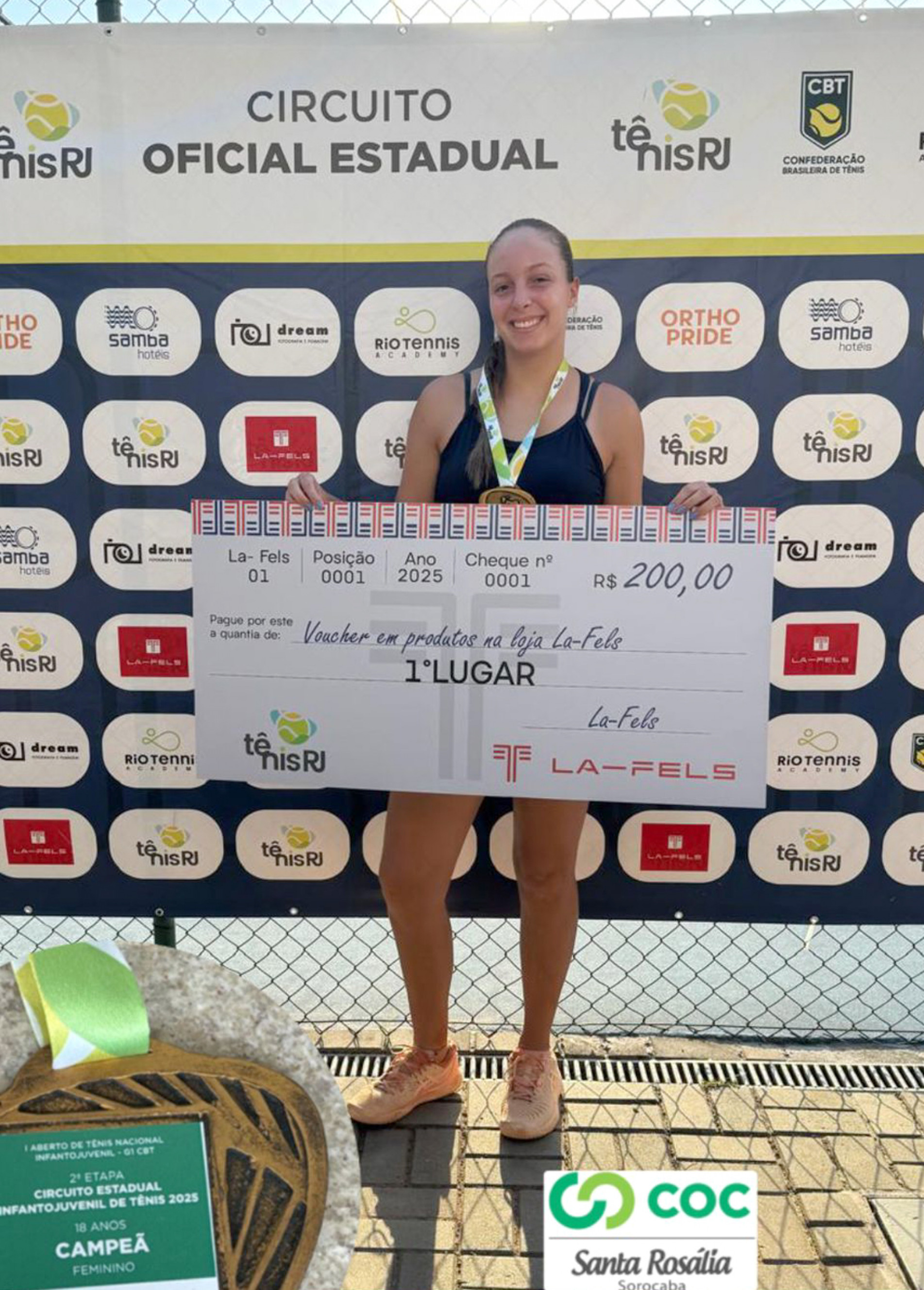 A sorocabana Alice Ghiraldi, 15 anos, acumulou mais uma medalha como tenista. Desta vez, o lugar mais alto do pódio foi no Aberto de Tênis Nacional Infantojuvenil 2025, realizado no Rio de Janeiro. A vitória veio em cima da mineira Bárbara Baeta, após dois sets com superioridade no placar.