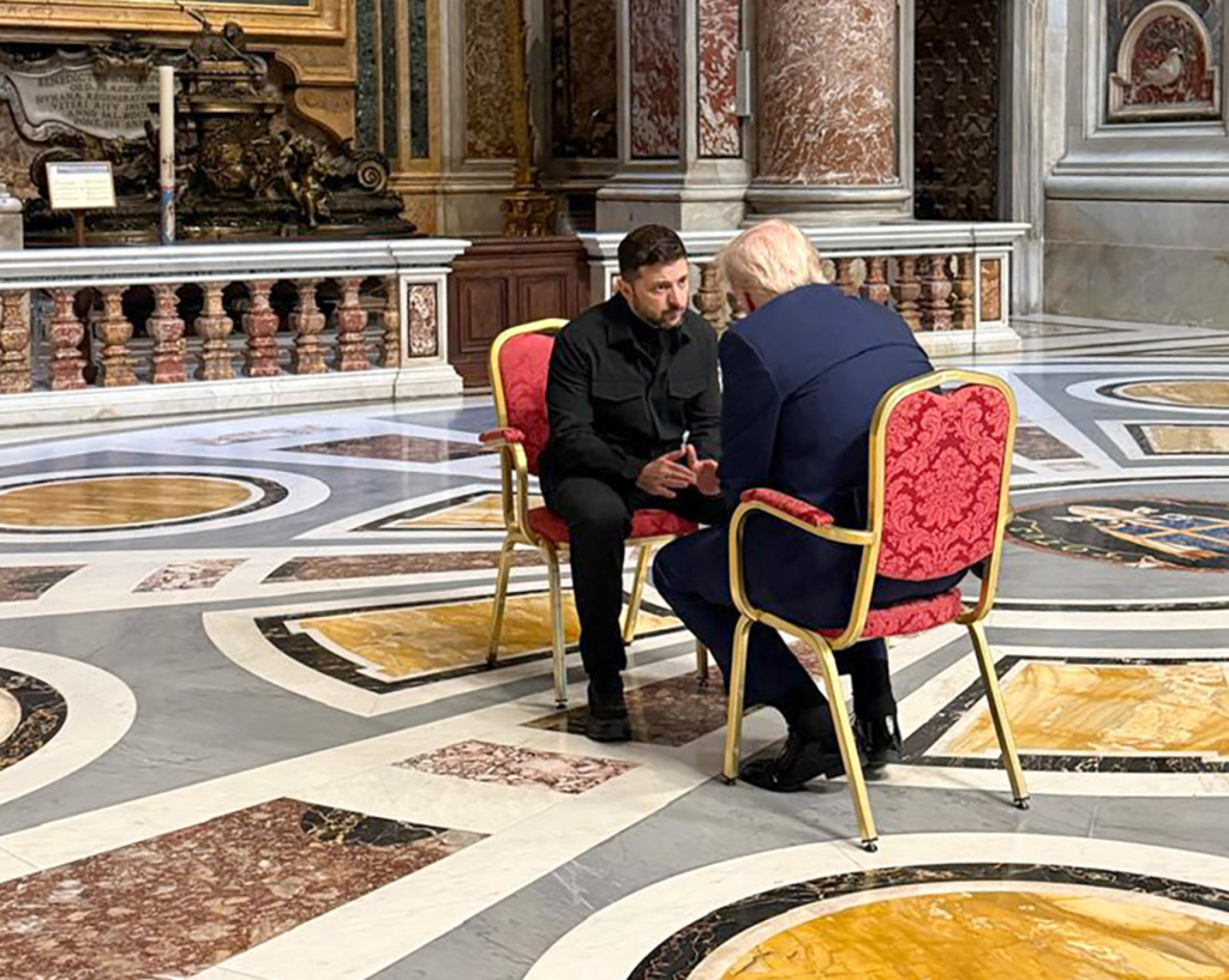 Os dois mandatários, sentados frente a frente e inclinados um em direção ao outro, segundo fotos divulgadas pela Presidência ucraniana, conversaram durante cerca de quinze minutos na Basílica de São Pedro. (AFP)