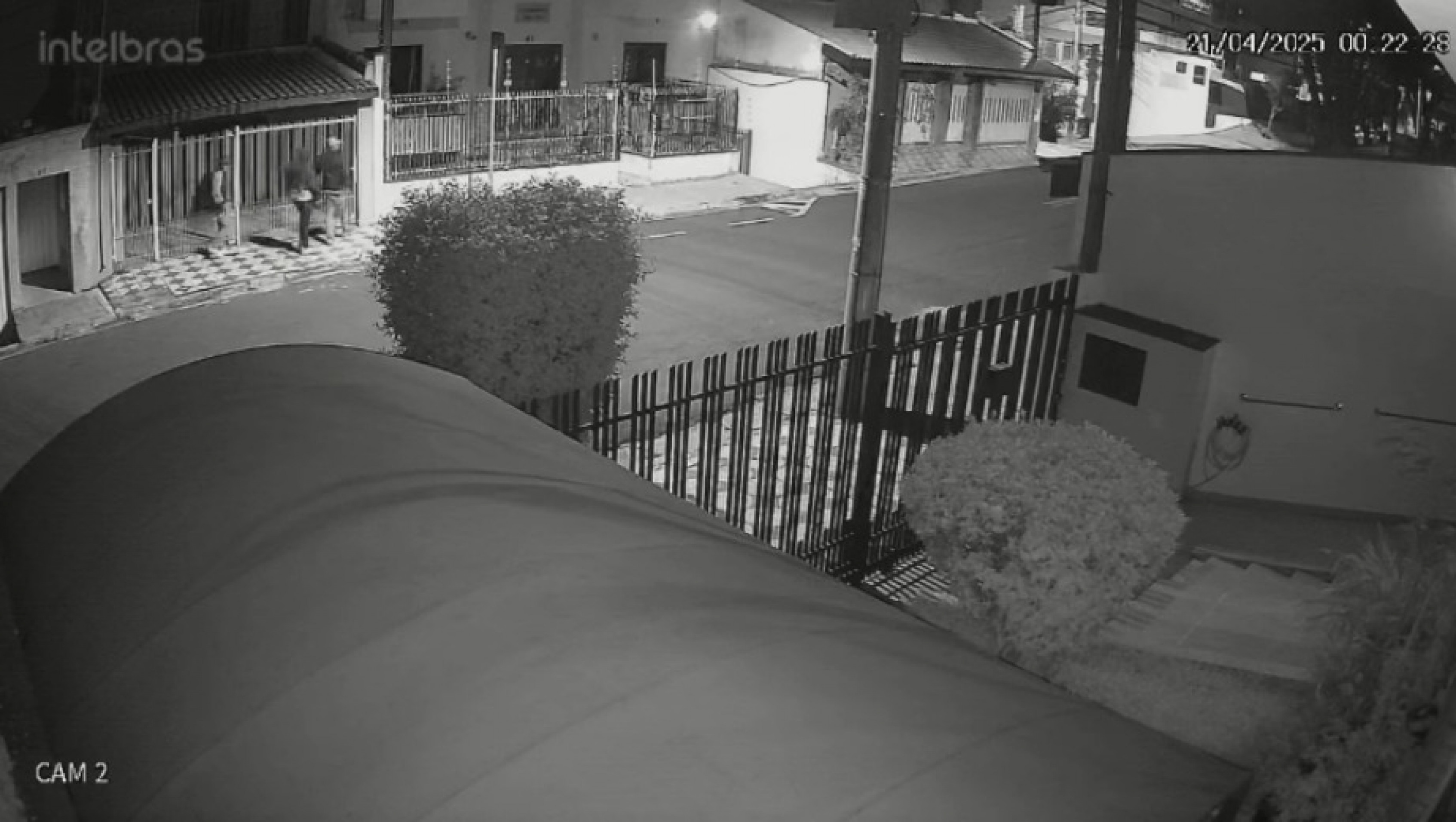 Câmeras de segurança da rua flagraram a ação dos suspeitos. Por volta das 00h15, eles passaram em frente à residência e, em questão de segundos, conseguiram arrombar e invadir o local.