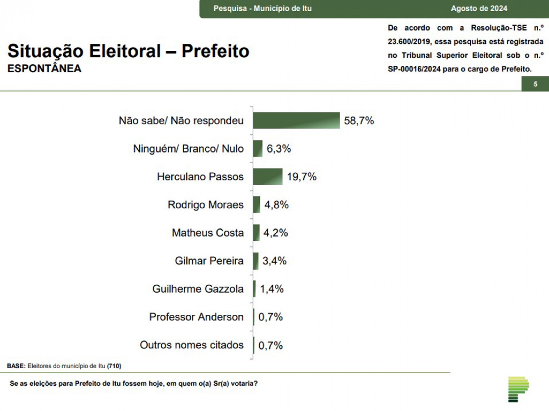 Na pesquisa espontânea, o número de eleitores que não sabiam ou não souberam responder prevaleceu, totalizando 58,7% dos ouvidos. Herculano Passos (Republicanos) foi citado por 19,7% dos entrevistados; 4,8% disseram que votariam em Rodrigo Moraes (PL), 4,2% em Matheus Costa (PSD), 3,4% em Gilmar Pereira (PP) e 1,4% em Guilherme Gazzola — atual prefeito de Itu, mas que não é candidato à reeleição. Professor Anderson (PT) aparece na última posição (0,7%). Outros 0,7% citaram outros nomes e 6,3% disseram que votariam em branco, anulariam o voto ou não votariam em nenhum dos candidatos.