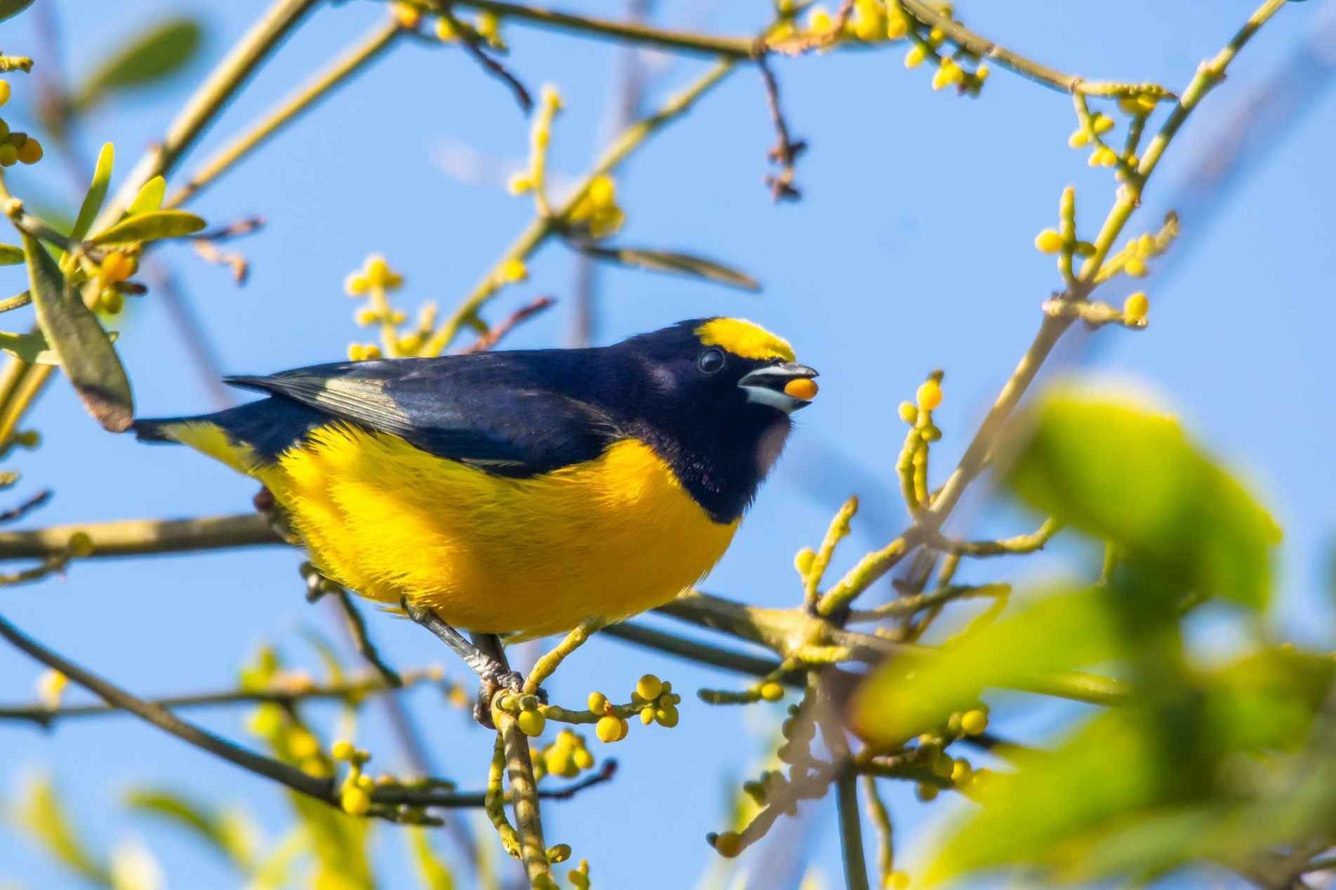 Observe o bico dela! Ela se alimenta de frutos e insetos e, assim, ajuda as plantas, dispersando suas sementes por meio das fezes. É muito comum observá-la comendo as frutinhas das ervas-de-passarinho. Algumas dessas plantas possuem um fruto do qual a semente tem uma espécie de visgo e, para consumir o fruto, a ave aperta bastante até ele romper a casca e ingere apenas a polpa e a semente, deixando cair a casca.