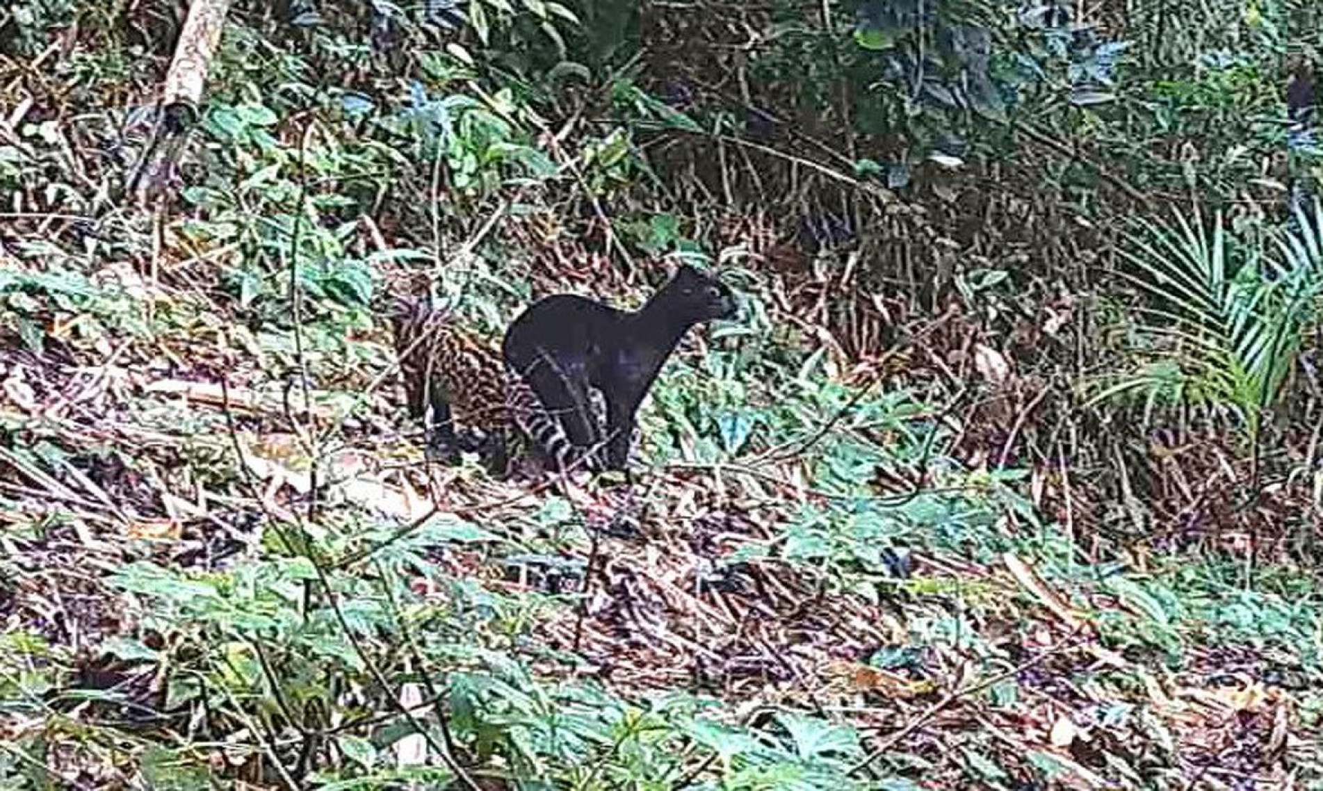 Um felino selvagem negro e raro foi registrado em reserva protegida na Mata Atlântica, no Paraná. A imagem, feita por meio de câmeras colocadas na reserva, mostra a mãe, com coloração inteiramente negra, e seu filhote com a coloração comum da espécie - o gato-do-mato-pequeno (Leopardus guttulus) - considerada em risco de extinção.