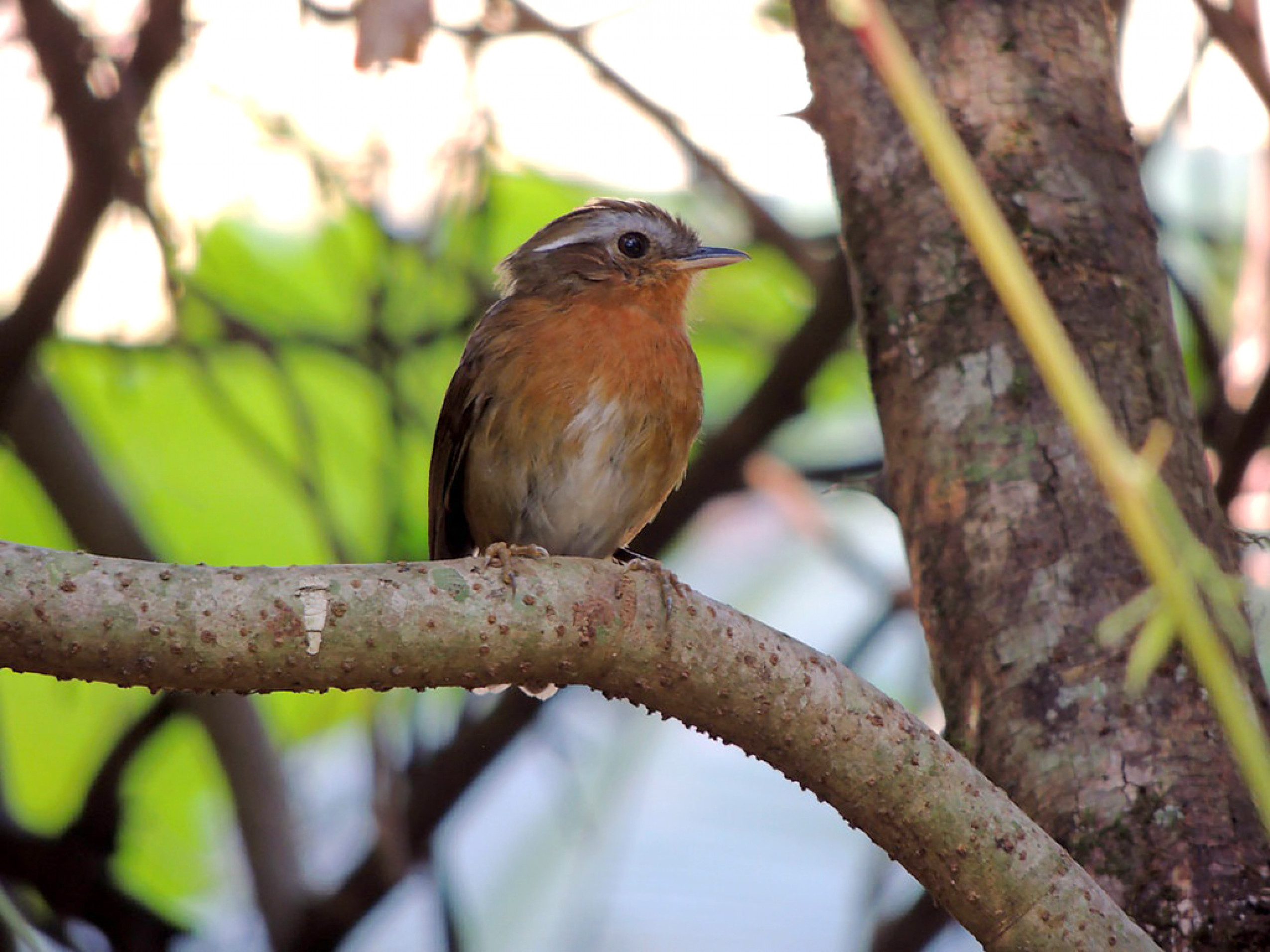 Observe a foto! Possui as costas e asas marrons, o peito e garganta alaranjados e barriga acinzentada com uma faixa esbranquiçada, que se estende da barriga até o peito. Sua sobrancelha é larga e cinza. O macho tem um tufo de penas brancas brilhantes atrás dos olhos, que parece um enfeite especial. Mede entre 11 e 14 centímetros.