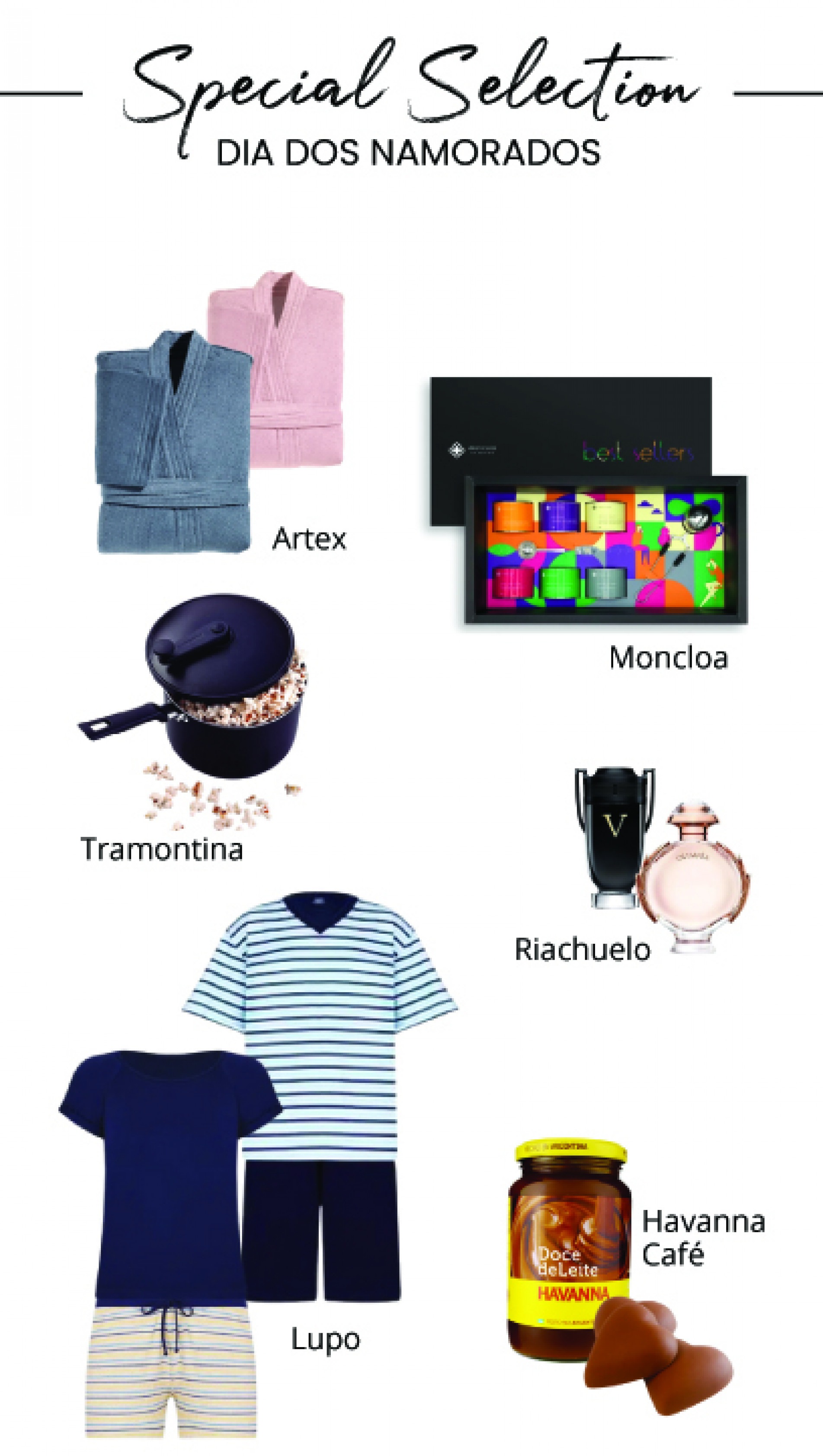 Os casais românticos, por exemplo, podem optar por perfumes nacionais e importados, joias, acessórios ou mimos criativos, nas operações: Riachuelo, Renner e C&A, Imaginarium, PaperSo, Moncloa e Tramontina.