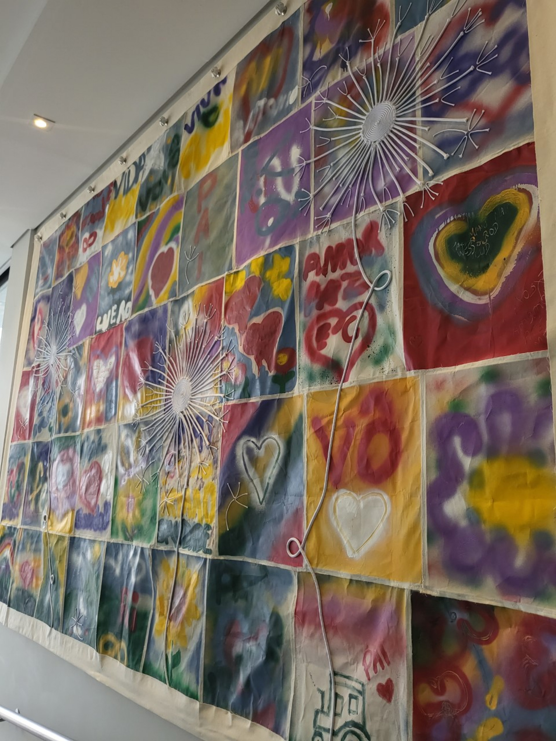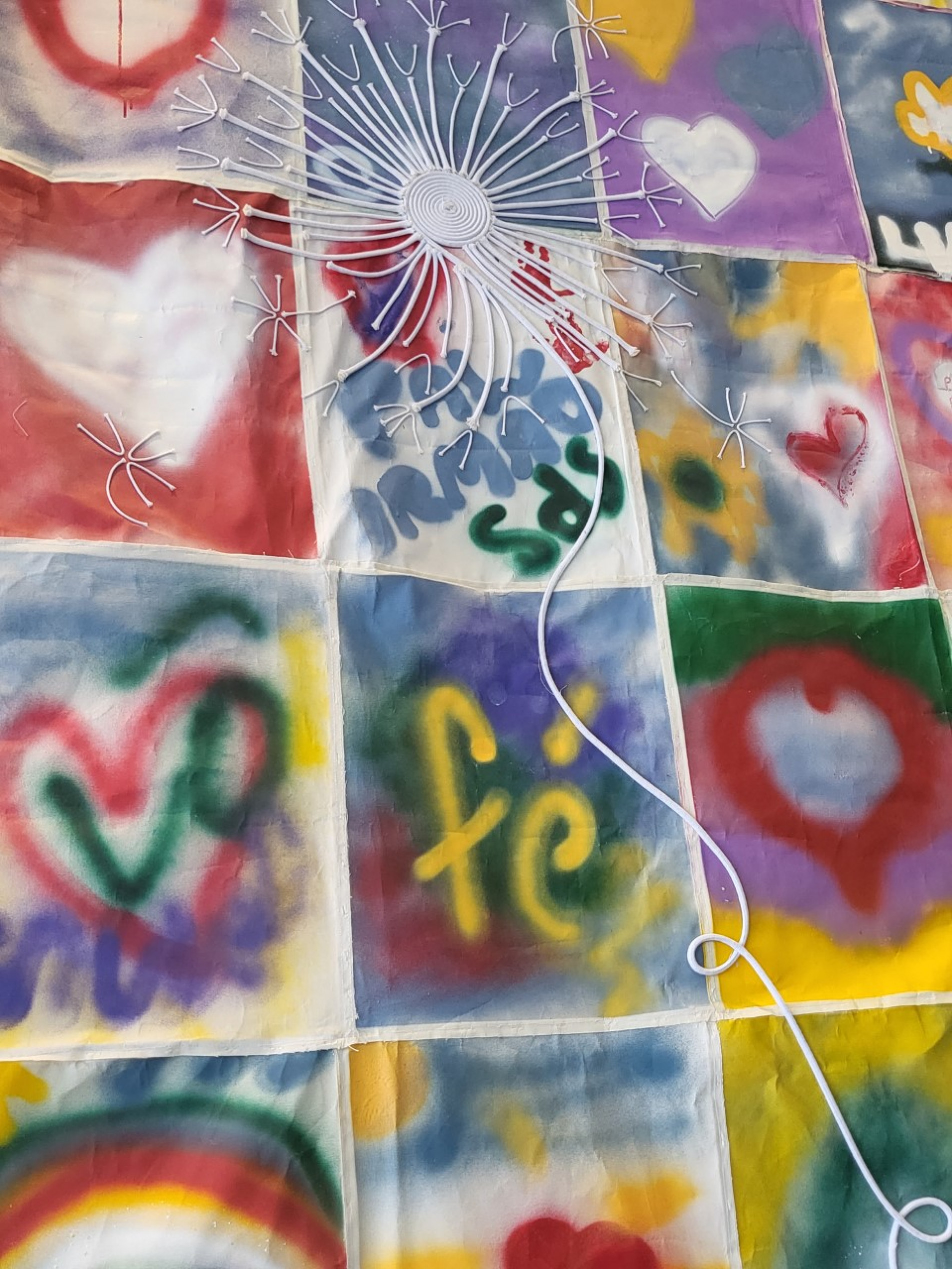 “Cada detalhe da obra foi pensado com muito carinho. Eu também vivenciei essa dor na pandemia. Em 2020, perdi meu pai para a covid-19. Então cada ponto da costura que uniu as telas representa as mais de 600 mil mortes pela doença no Brasil; representa o ‘vai e vem’ na linha da vida. E todos nós passamos por esse período juntos, de mãos dadas”, pontua Júlia.