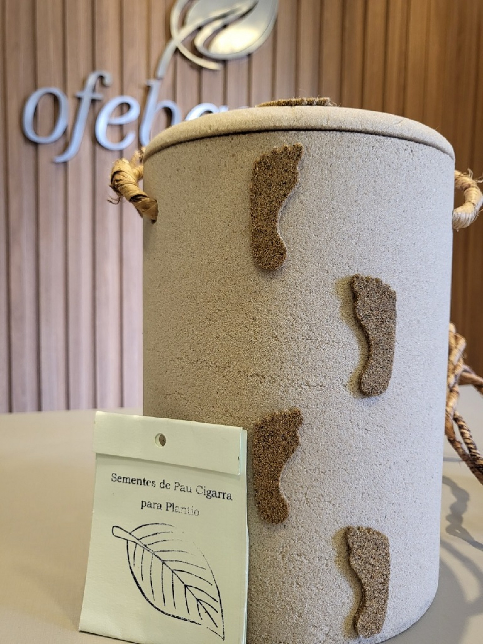 Todos os itens que a gerente salienta fazem parte das opções oferecidas pela Ofebas. A escolha das urnas de cremação também carrega significados. Esse é o exemplo da “urna navegar”. Com formato de barquinho, o objeto, feito com micélio, tem como objetivo proporcionar uma homenagem poética e acalentadora nas águas. Ao ser biodegradável, ela pode ser colocada em rios, mares e oceanos.