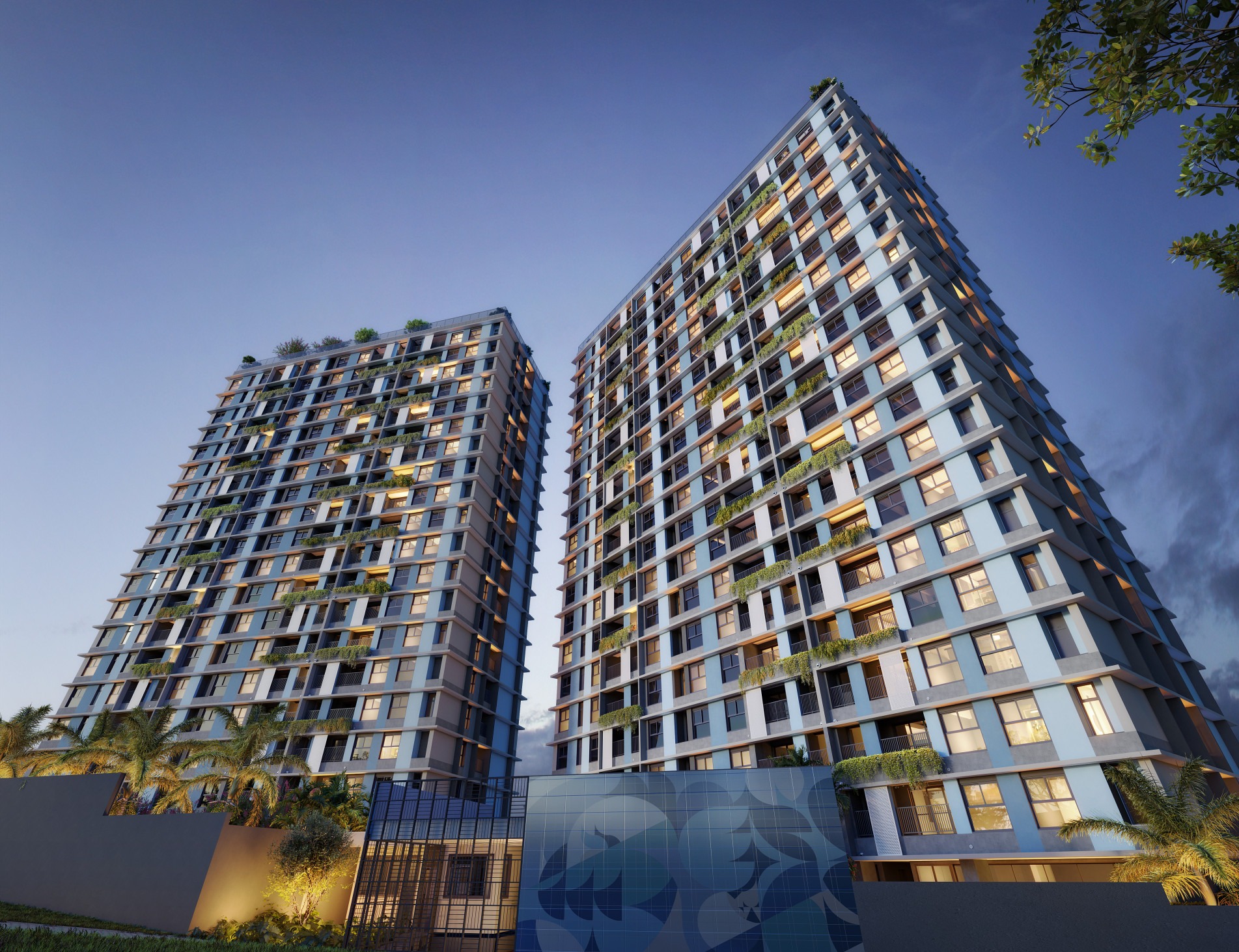 A fachada é um grande diferencial e um bom exemplo da implementação dessas ideias no projeto. Com varandas em todos os apartamentos, o espaço visa incorporar a vegetação entre os andares das duas torres, formando um grande jardim vertical.
