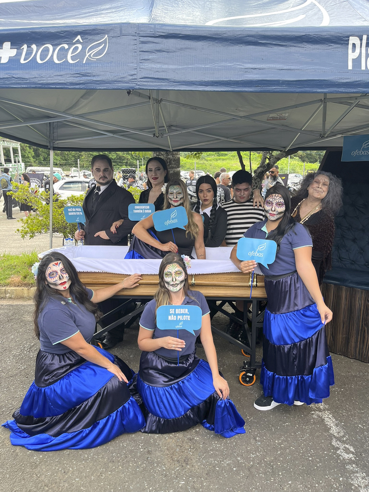 Durante o evento, a instituição aliou orientação direta a uma intervenção artística. Personagens caracterizados como Família Addams percorreram o espaço em uma encenação que utilizava humor para chamar a atenção do público. A proposta foi reforçar, de forma leve e criativa, a mensagem de que álcool e direção não combinam, estimulando a reflexão por meio da arte.
