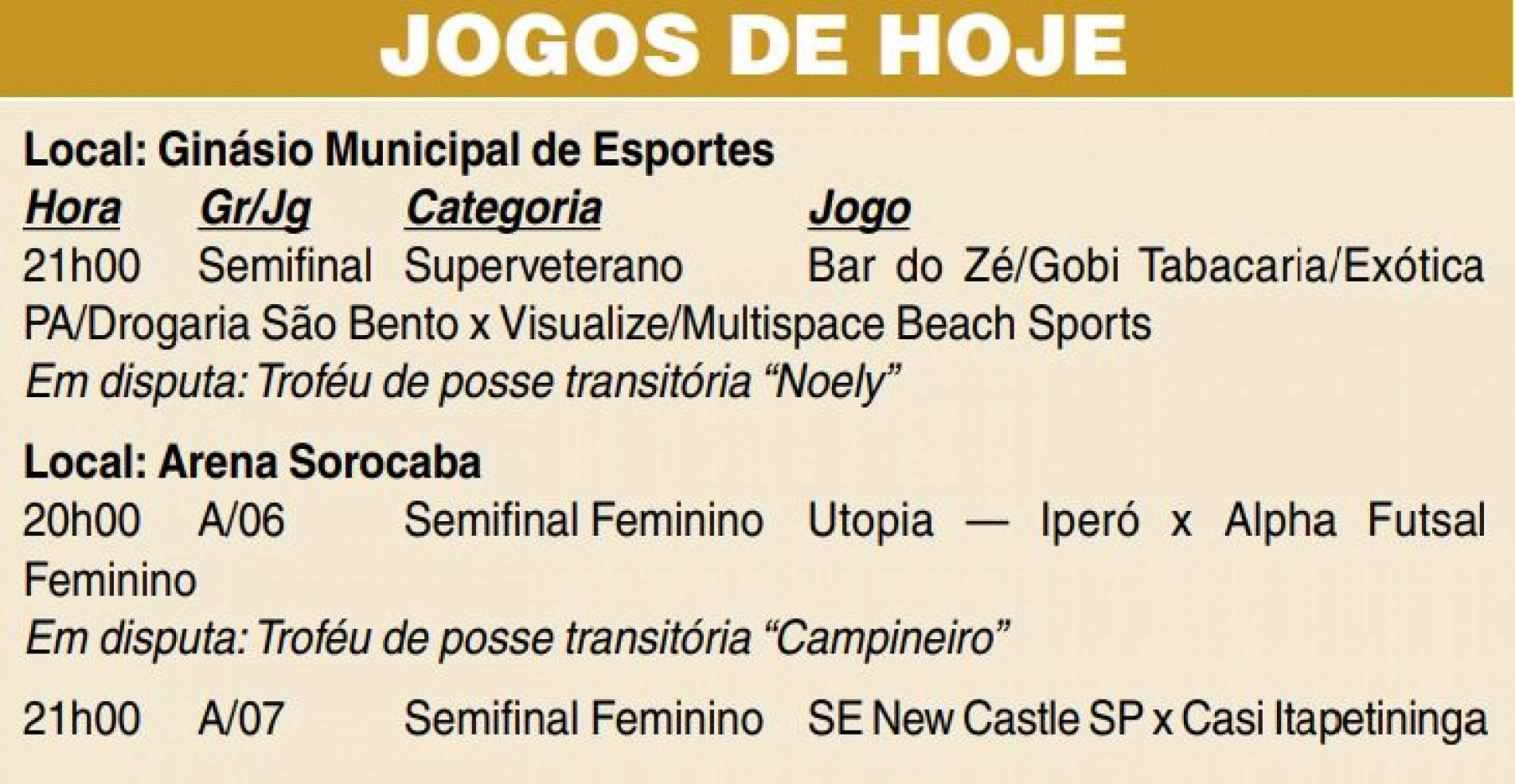 Já as partidas do Feminino ocorrem na Arena Sorocaba, entre Utopia -- Iperó e Alpha Futsal Feminino, às 20h, valendo também a posse transitória do troféu “Campineiro”; e SE New Castle SP x Casi Itapetininga, às 21h.
