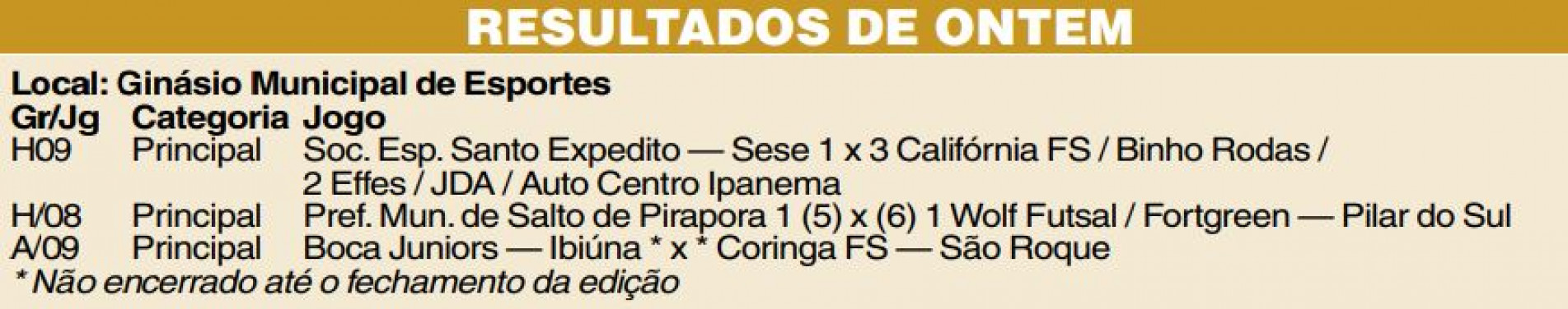 Três jogos da categoria Principal fecharam ontem (28), no Ginásio Municipal Dr. Gualberto Moreira, a quinta semana do 64º Torneio Aberto de Futsal Cruzeiro do Sul, o Cruzeirão 2023. O Califórnia FS venceu o Santo Expedito/Sese por 3 a 1 e o Wolf Futsal / Fortgreen, de Pilar do Sul, eliminou a PM de Salto de Pirapora nos pênaltis, por 6 a 5, após empate por 1 a 1. Boca Juniors -- Ibiúna x Coringa FS -- São Roque não foi encerrado até o fechamento da edição.