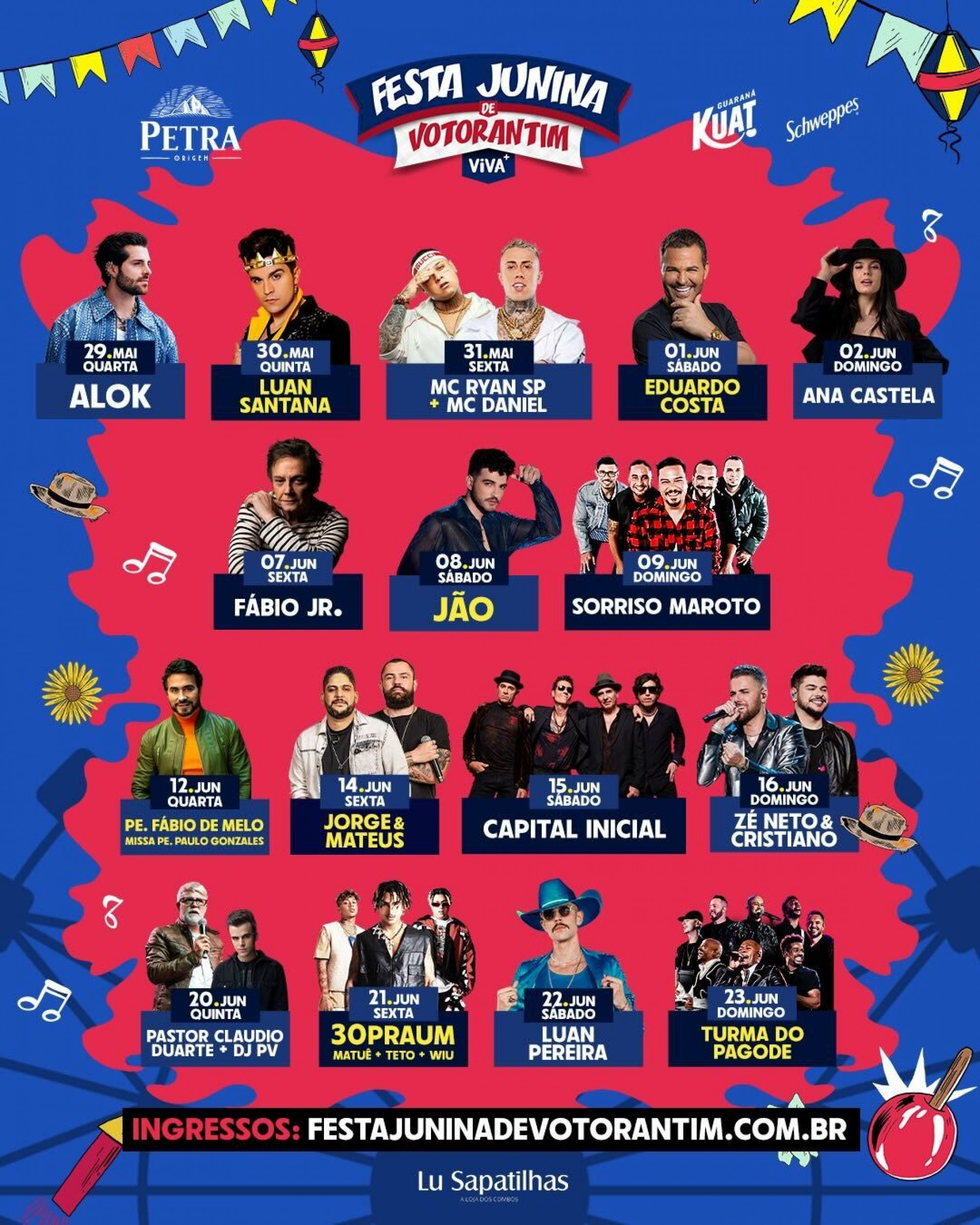 Considerada a maior festa junina do estado de São Paulo, a Festa Junina de Votorantim anuncia a programação de shows desta edição. Ao todo, 17 atrações - dos mais variados gêneros – sobem ao palco, sendo que dez delas se apresentam pela primeira vez no evento. A festa, que é organizada pela Viva+ Entretenimento, será realizada de 29 de maio a 23 de junho, de quarta a domingo.