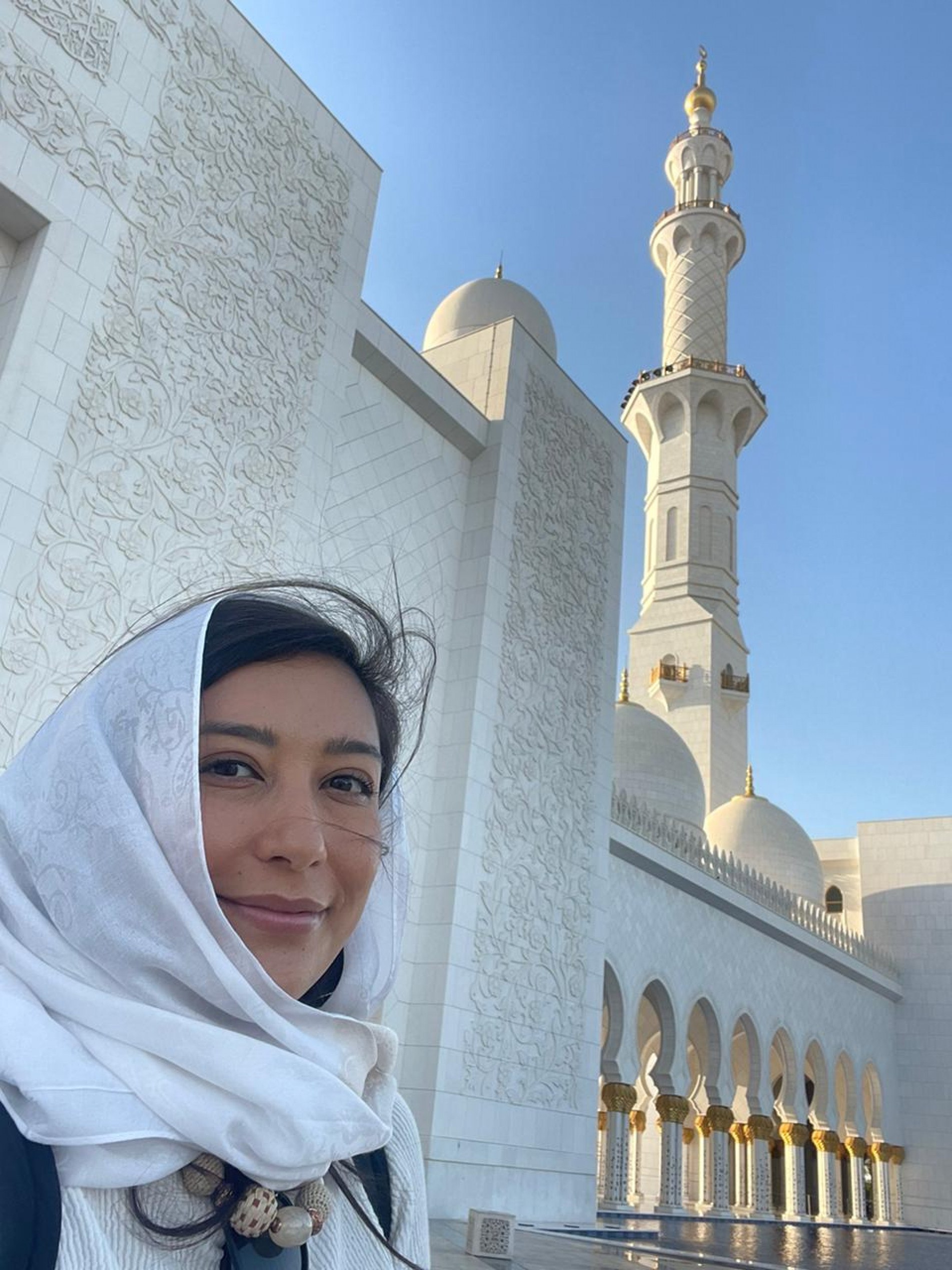 Renata Maron está cobrindo pela quarta vez o Oriente Médio e realizando entradas ao vivo nos canais Terra Viva, BandNews e AgroMais. Nos últimos meses foram três idas aos Emirados Árabes Unidos. Volta ao Brasil neste fim de semana. Na foto, ela está frente a Mosque de Abu Dhabi.