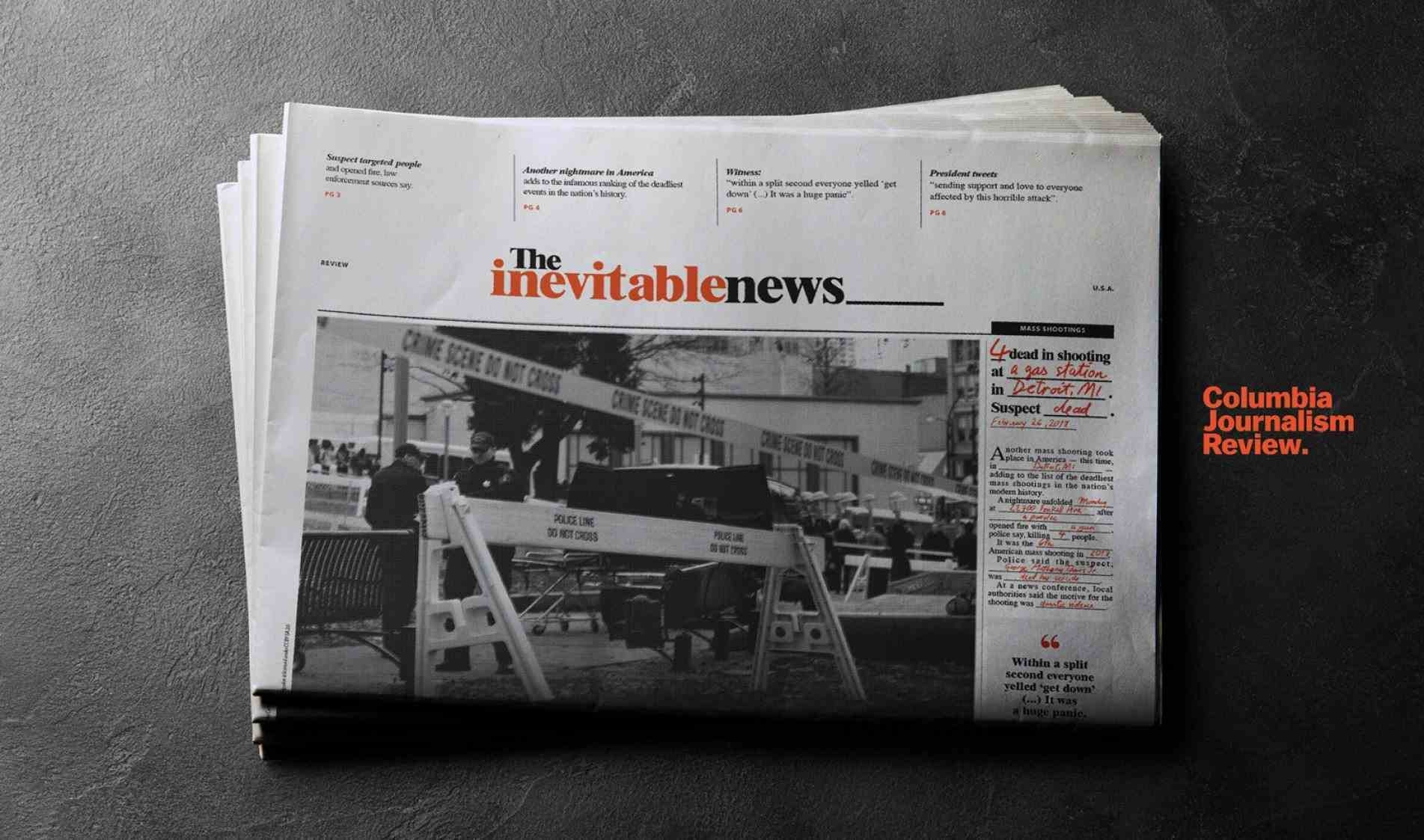 Pensando em encontrar solução para o problema e destacar as falhas recorrentes nas abordagens adotadas pelos jornais dos EUA, Barros e sua equipe iniciaram o projeto ‘The Inevitable News’. A peça usou os projetos gráficos de 15 dos principais jornais do país e substituiu informações básicas das reportagens. O lead — jargão jornalístico usado para se referir ao parágrafo que responde perguntas essenciais para contar a história de maneira curta — ficou em branco e letras vermelhas, simulando traço de caneta, deram lugar as tradicionais fontes serifadas dos exemplares.