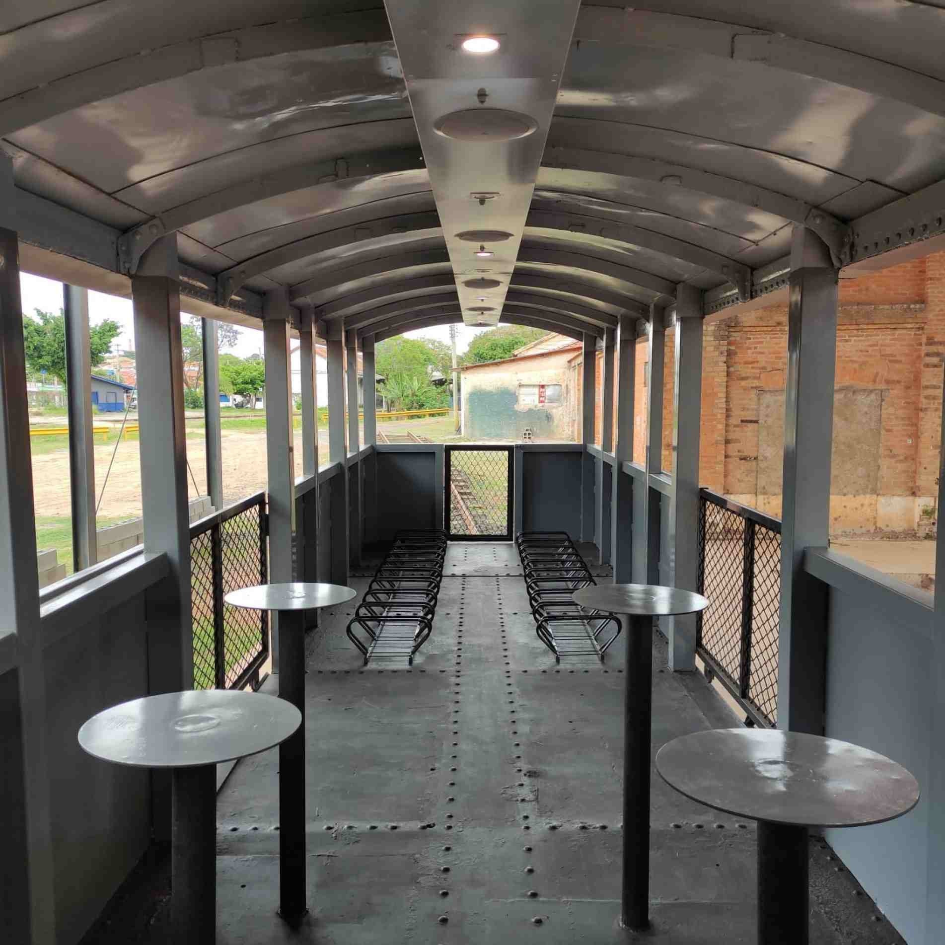 No lugar de bancos, há mesas altas, no estilo bistrô; estrutura para chopeira, balcão, caixa térmica e até suportes para bicicletas e motos. Com as laterais abertas e sem janelas, o carro é bem arejado e amplo, com vista privilegiada da paisagem às margens da ferrovia.