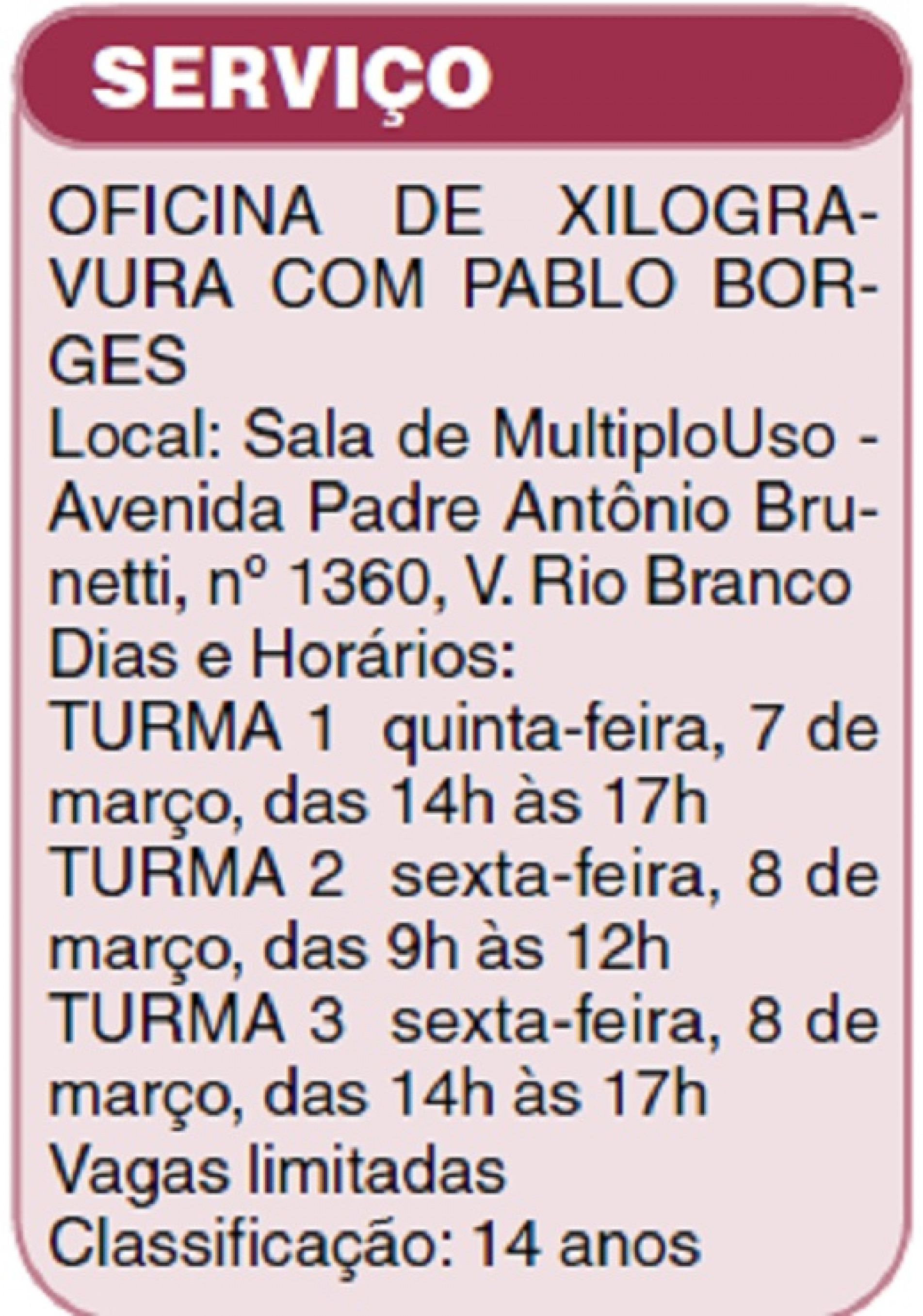 Em março, o artista Pablo Borges vai realizar oficinas gratuitas de xilogravura, no Sesi Itapetininga. Serão três oportunidades entre os dias 7 e 8 de março para educadores, estudantes, artistas e interessados realizarem a oficina com duração de 3 horas. A atividade é gratuita e voltada para pessoas a partir de 14 anos. As vagas são limitadas e as inscrições, que começam hoje (29), podem ser feitas por meio da plataforma Meu Sesi (www.sesisp.org.br/Eventos).