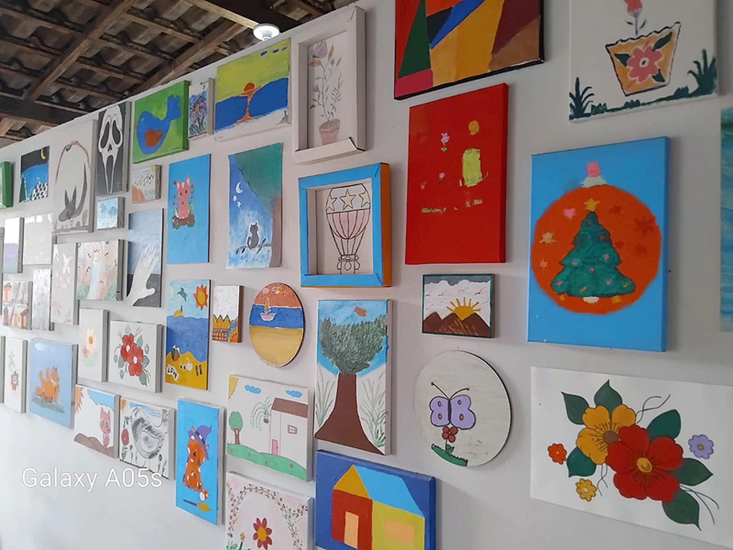 Após o término das produções artísticas, os materiais são colocados nas paredes e estantes, como uma forma de exposição e de decoração do espaço.
