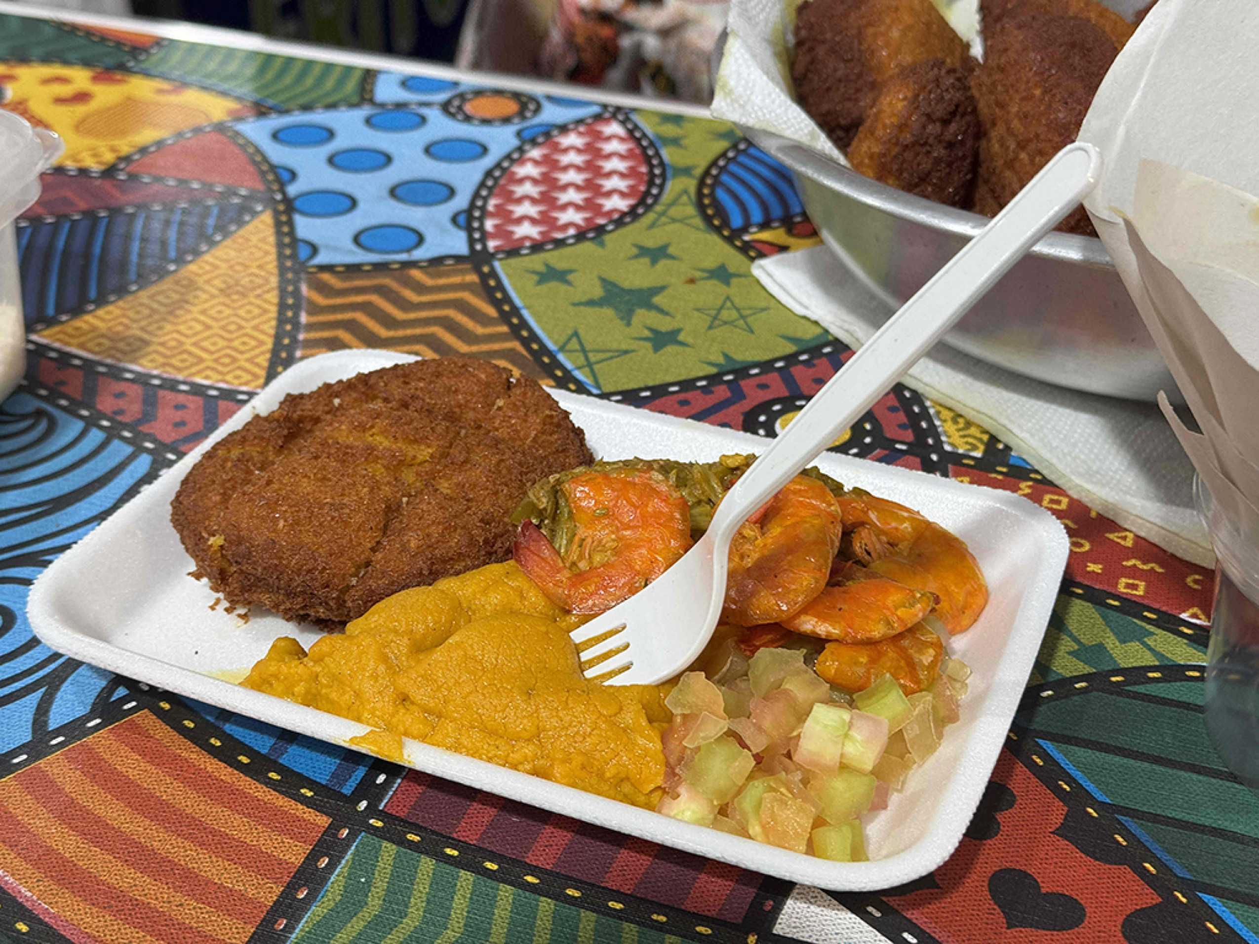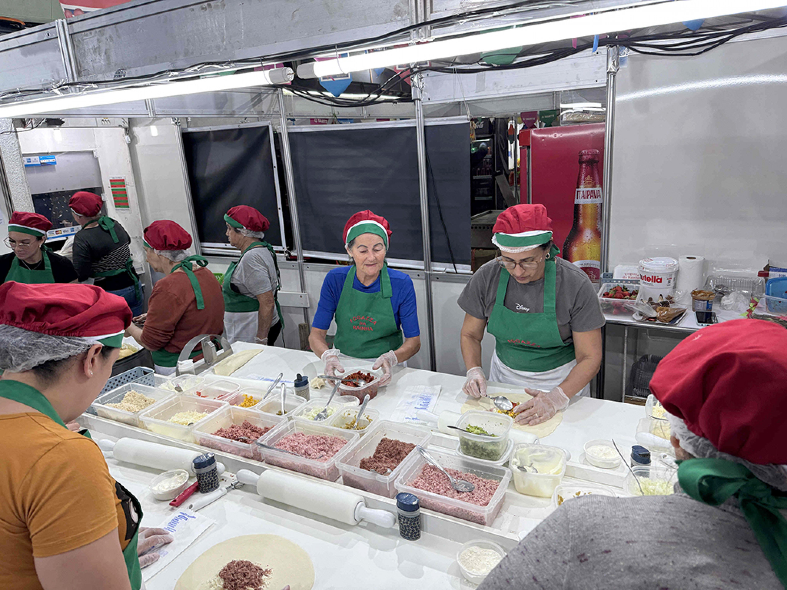 Mais conhecida como pizza frita, a fogazza oferece sabores variados na barraca Nossa Senhora Rainha da Paz. O carro chefe é a fogazza vegana, recheadíssima com brócolis, tomate seco, azeitona fatiada, milho, tomate e ervilha.