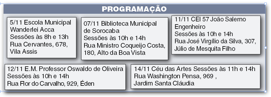 A Cia Cria Mundos realiza apresentações gratuitas em diferentes pontos da cidade com o espetáculo “Histórias com a Mafralda”, voltado ao público infantil. A proposta é levar teatro e imaginação a escolas e espaços públicos de Sorocaba.