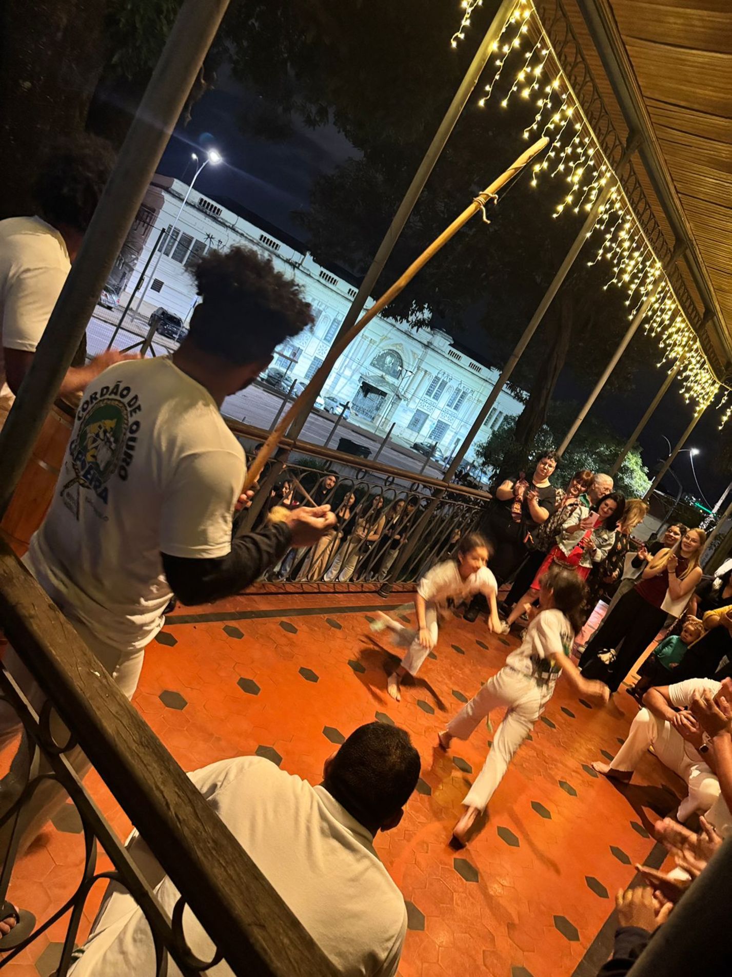 O evento também foi marcado pela apresentação do grupo de capoeira Cordão de Ouro, que utilizou as sacadas da casa para sua performance, misturando luta, dança e ritmos brasileiros tocados no berimbau e no atabaque.