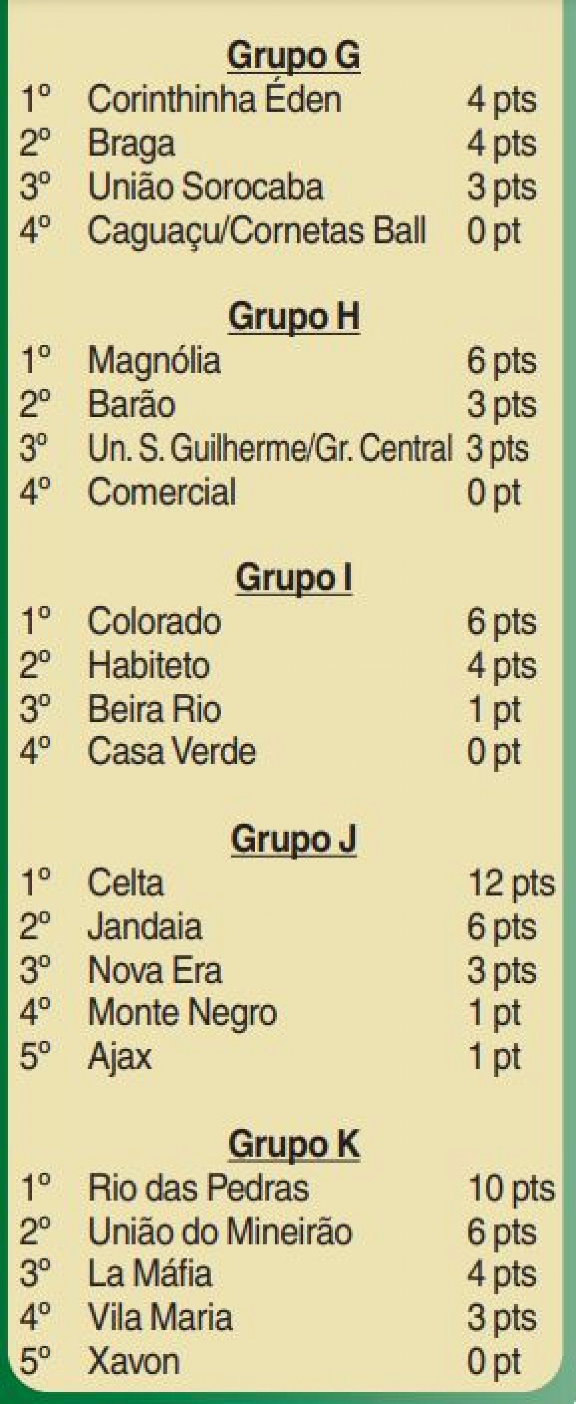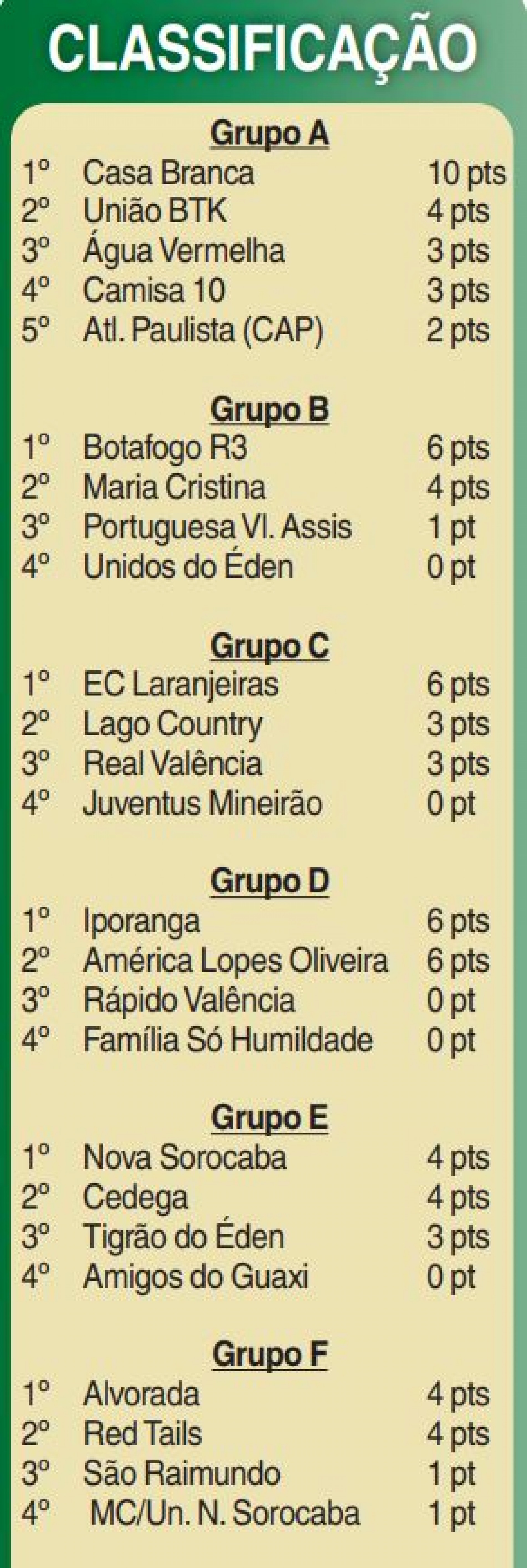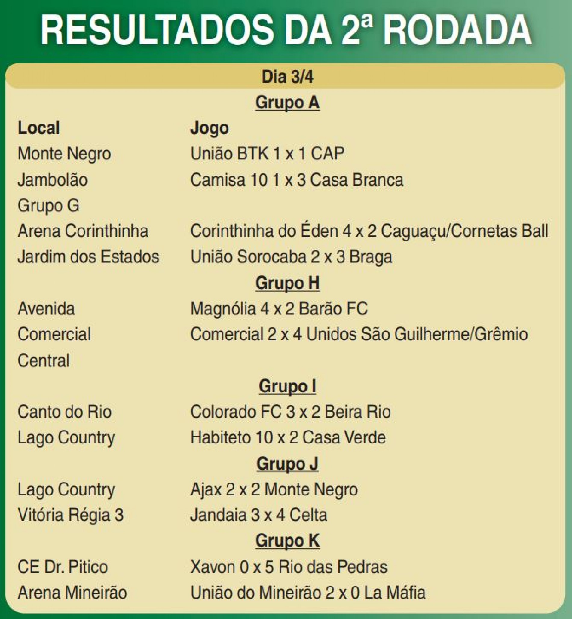 A maior goleada foi registrada no Lago Country, pelo Grupo I, onde o Habiteto fez 10 a 2 no Casa Verde. O Casa Branca (Grupo A) foi uma das equipes que assegurou classificação antecipada à segunda fase ao derrotar o Camisa 10 por 3 a 1 no Jambolão. Entre os times que já disputaram quatro partidas, apenas o Celta, no Grupo J, tem 100% de aproveitamento: a quarta vitória foi registrada sobre o Jandaia, por 4 a 3, em jogo no Vitória Régia 3. Com 12 pontos, é a melhor campanha da primeira fase.