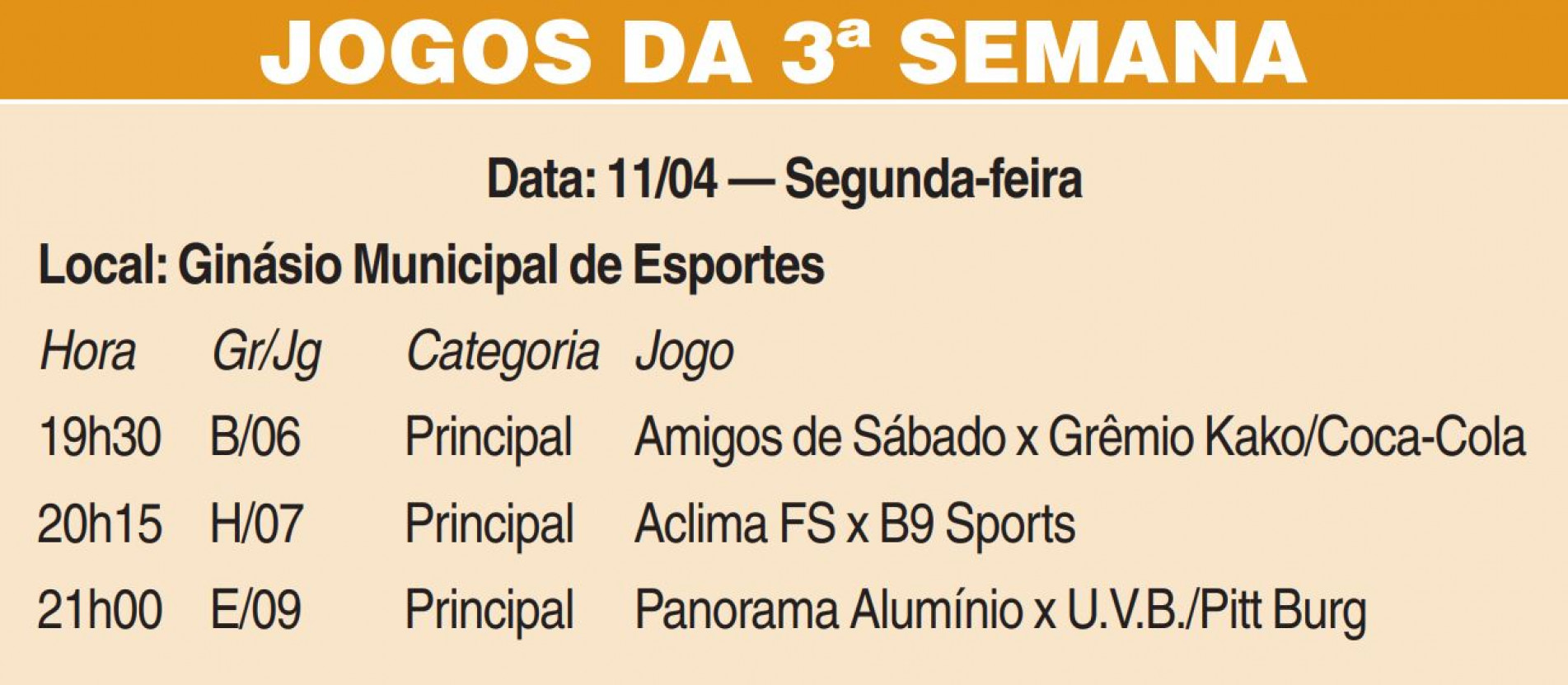 Publicamos incorretamente o placar do jogo entre Galera Fute Sábado e EC Colônia Futsal, realizado na última quinta-feira (7), no Ginásio Municipal. O EC Colônia Futsal é quem goleou o Galera Fute Sábado por 5 a 2, e não o contrário. Conforme a Sequav, houve erro no preenchimento da súmula do jogo pela arbitragem. (Da Redação)