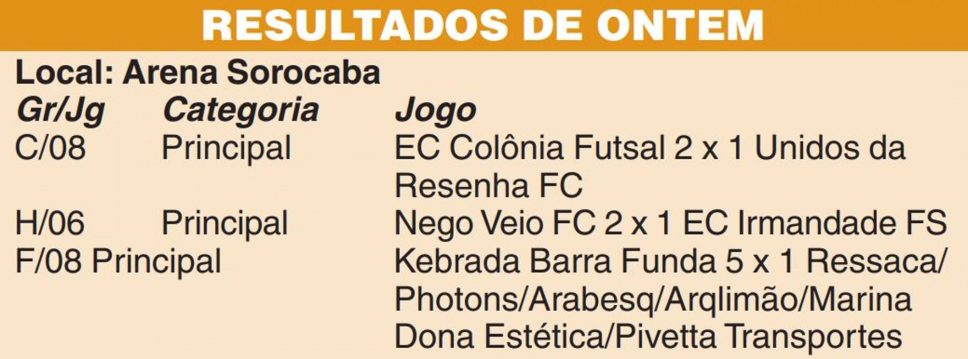 A quarta semana do 63º Torneio Aberto de Futsal Cruzeiro do Sul, o Cruzeirão 2022, terminou ontem (20), com três jogos da categoria Principal na Arena Sorocaba e mais três classificados às oitavas de final. EC Colônia Futsal e Nego Veio FC eliminaram Unidos da Resenha FC e EC Irmandade FS, respectivamente, por 2 a 1. O Kebrada Barra Funda goleou o Ressaca por 5 a 1.