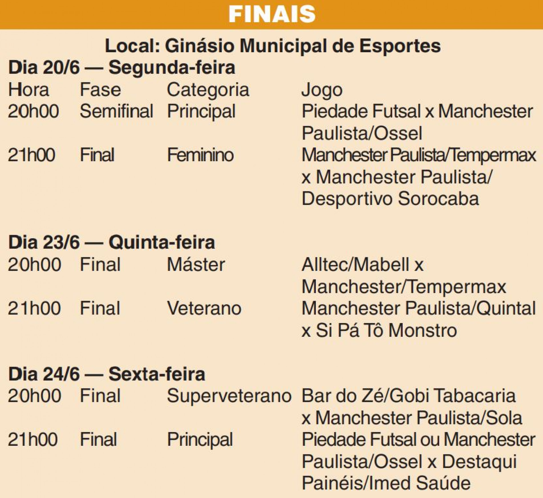 A noite de 20 de junho (segunda-feira) será aberta pela segunda semifinal da categoria Principal entre Piedade Futsal x Manchester Paulista/Ossel, às 20h. Quem vencer encara o Destaqui Painéis / Imed Saúde na sexta (24), às 21h, na final mais aguardada do campeonato. Na sequência, às 21h, será conhecido o primeiro campeão de 2022: os “co-irmãos” Manchester Paulista/Tempermax e Manchester Paulista/Desportivo Sorocaba disputam a taça do Feminino.