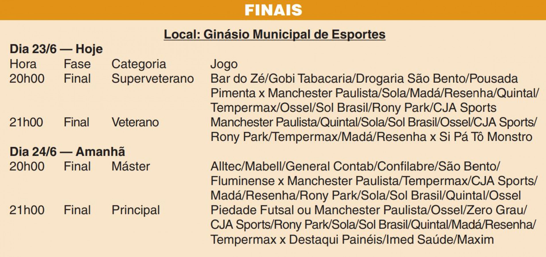 A noite começa com a disputa de título no Superveterano, entre Bar do Zé/Gobi Tabacaria x Manchester Paulista/Sola. Na sequência, o caneco em jogo é o do Veterano, a partir das 21h, com Si Pá Tô Monstro x Manchester Paulista/Quintal. Não será permitida a entrada de torcedores no Ginásio Municipal com instrumentos musicais, bandeiras com mastro, garrafas, latas e capacetes.