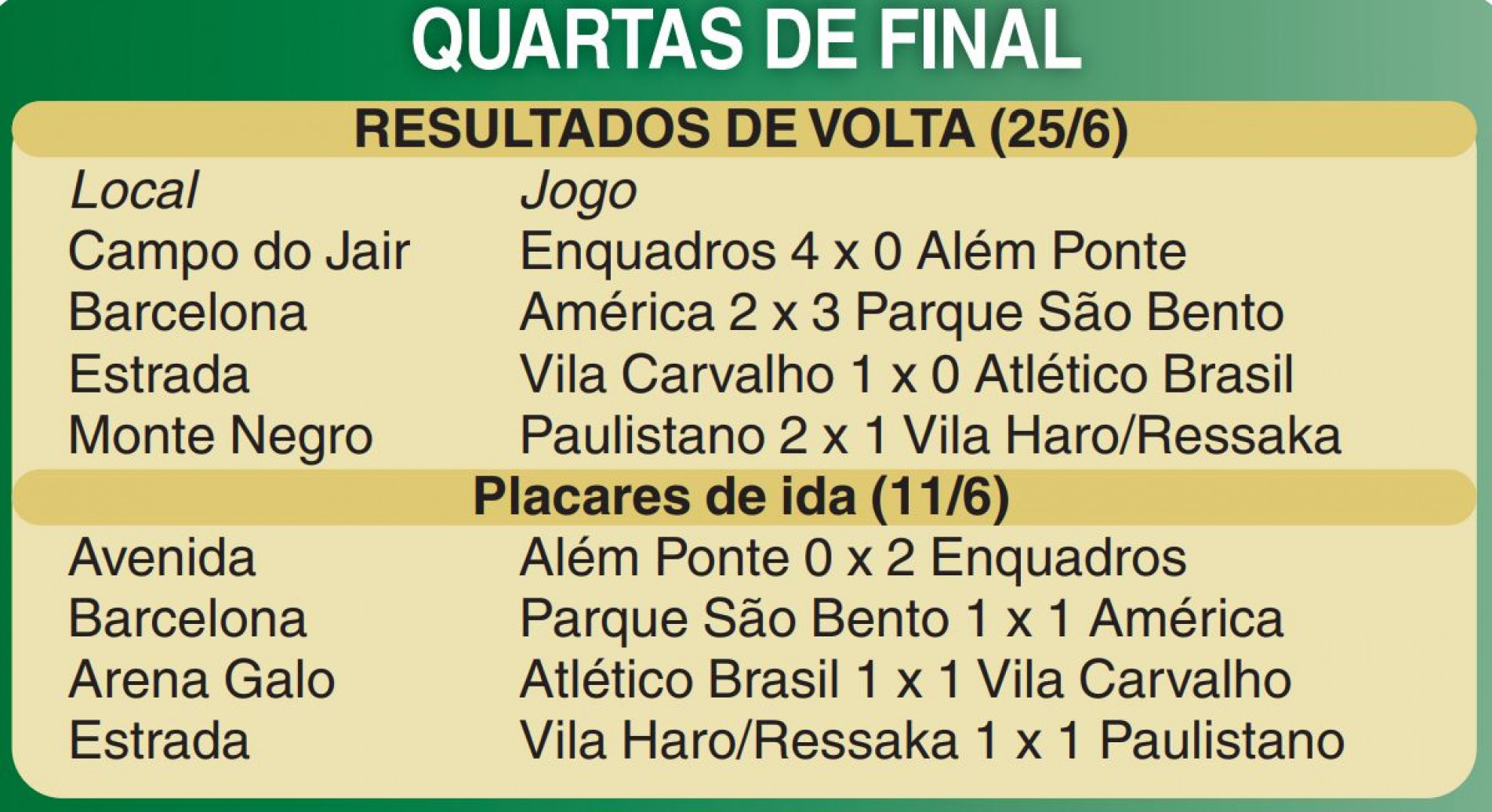 As semifinais serão disputadas em dois jogos, neste e no próximo sábado (dias 2 e 9 de julho). Os confrontos são: Vila Carvalho x Enquadros e Parque São Bento x Paulistano. Os locais e horários ainda serão confirmados pela Secretaria de Esporte e Qualidade de Vida (Sequav), que organiza a competição. (Da Redação)