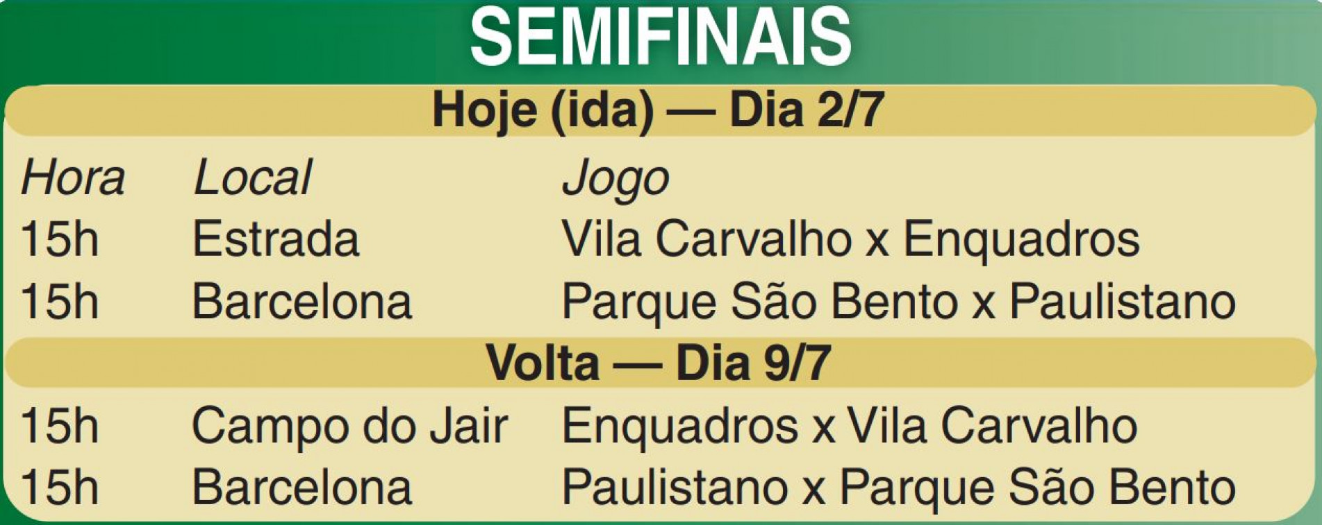 O Parque São Bento joga contra o Paulistano no Euzébio Moreno. As duas equipes eliminaram, respectivamente, América e Vila Haro/Ressaka com uma vitória (3 a 2 e 2 a 1) e um empate (ambos por 1 a 1).