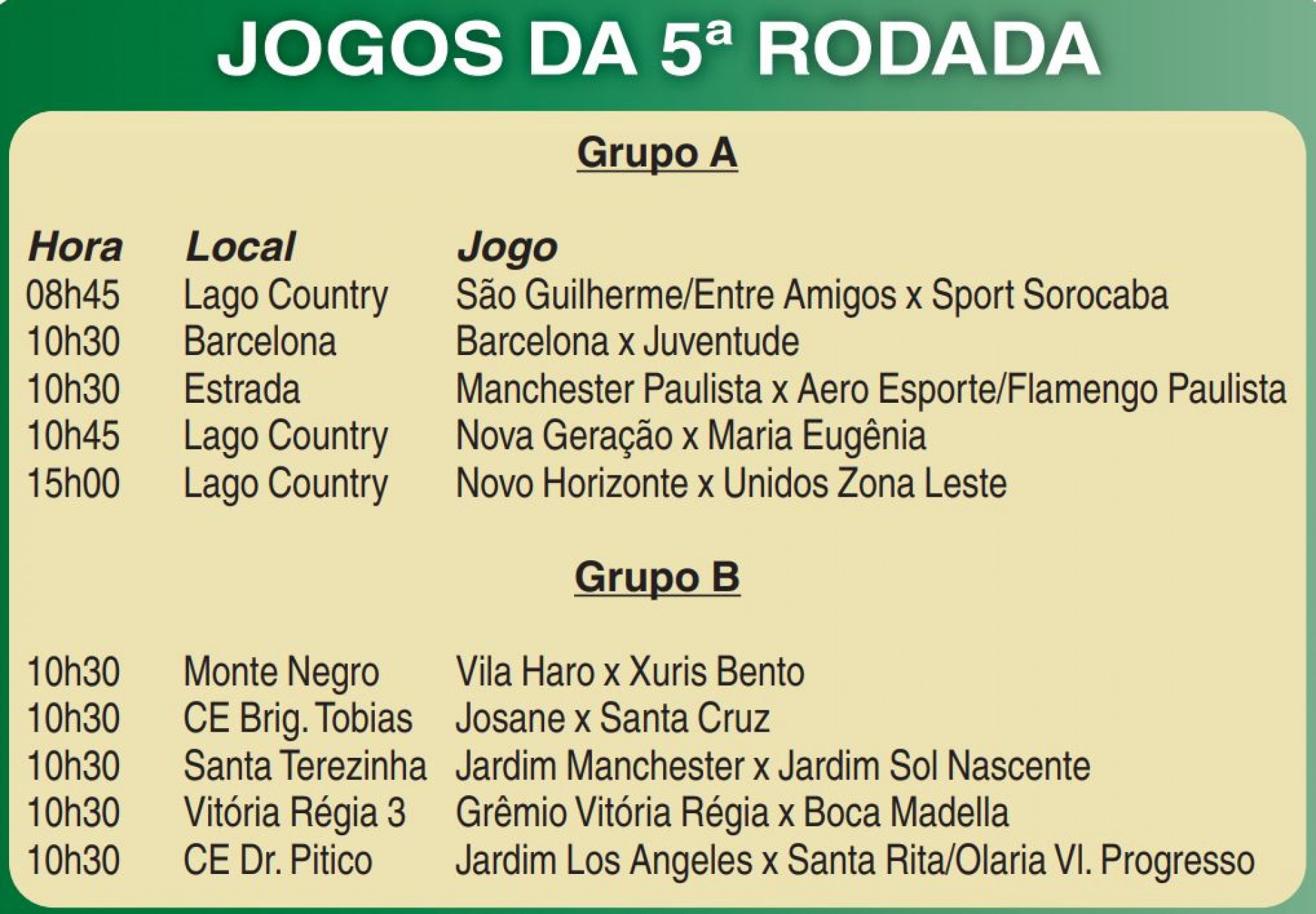 No Grupo A, o líder Manchester Paulista, que tem 12 pontos, enfrenta o lanterna Aero Esporte/Flamengo Paulista, que ainda não pontuou, às 10h45 no Rui Costa Rodrigues (Estrada).