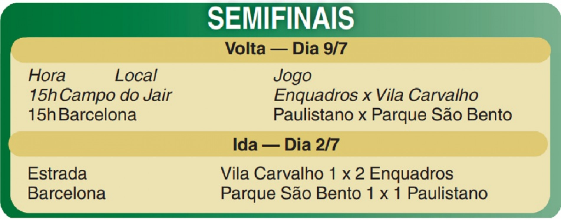 No outro jogo, Parque São Bento e Paulistano empataram por 1 a 1. Novo empate no sábado, também às 15h, de novo no Euzébio Moreno, levará a decisão do finalista para as cobranças de pênaltis. (Da Redação)