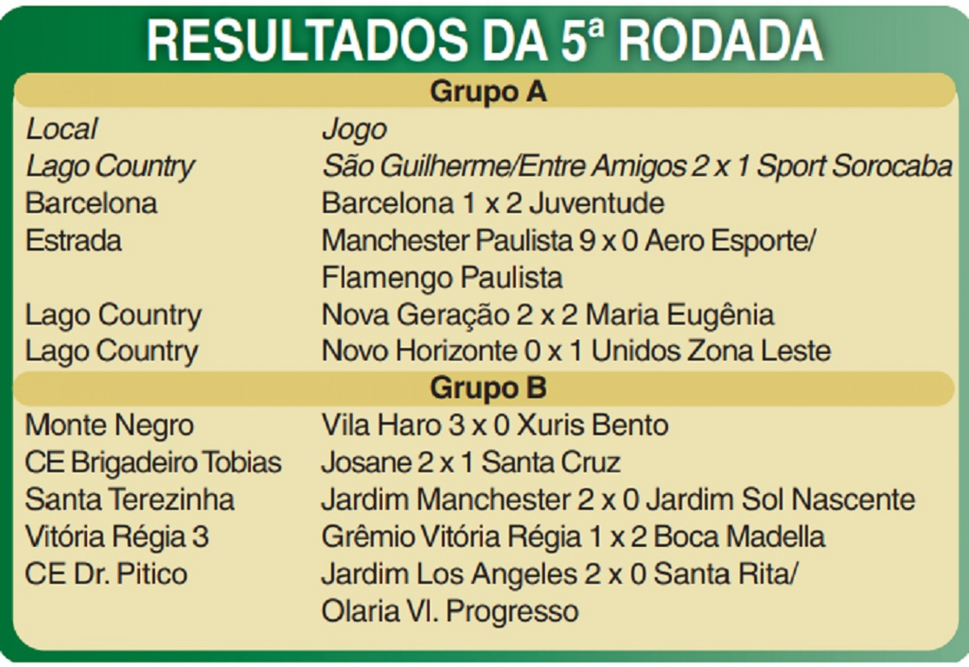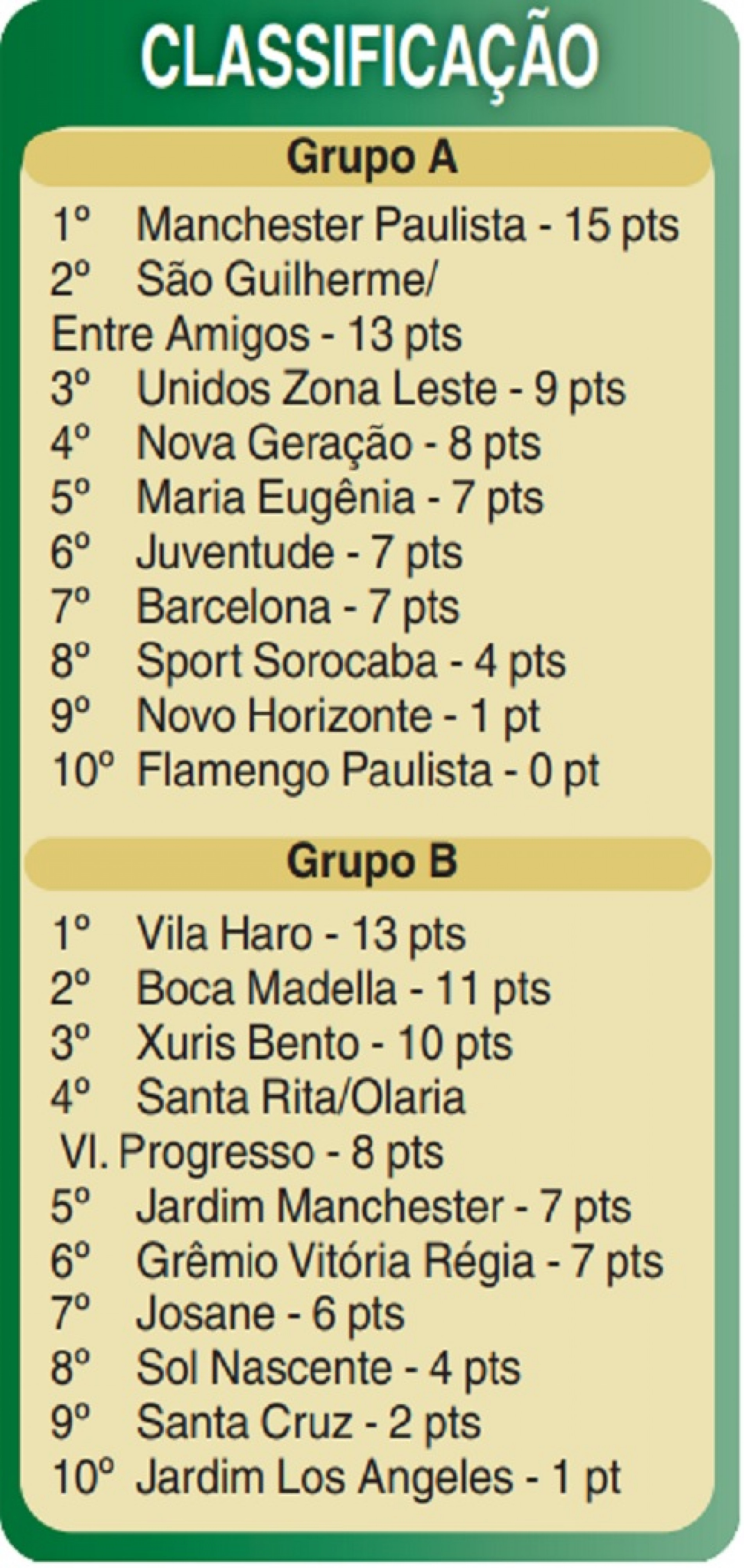 No Grupo A, o Manchester Paulista goleou o lanterna Aero Esporte/Flamengo Paulista por 9 a 0 no estádio Rui Costa Rodrigues (Estrada) e segue na liderança, com 15 pontos. É o último time com 100% de aproveitamento na competição. Pelo Grupo B, ao vencer o Xuris Bento por 3 a 0, no Monte Negro, o Vila Haro se isolou na ponta, com 13 pontos, enquanto o concorrente direto caiu para terceiro, com 10. Melhor para o Boca Madella, o novo vice-líder, que foi a 11 pontos ao ganhar do Grêmio Vitória Régia por 2 a 1 no Vitória Régia 3. (Da Redação)