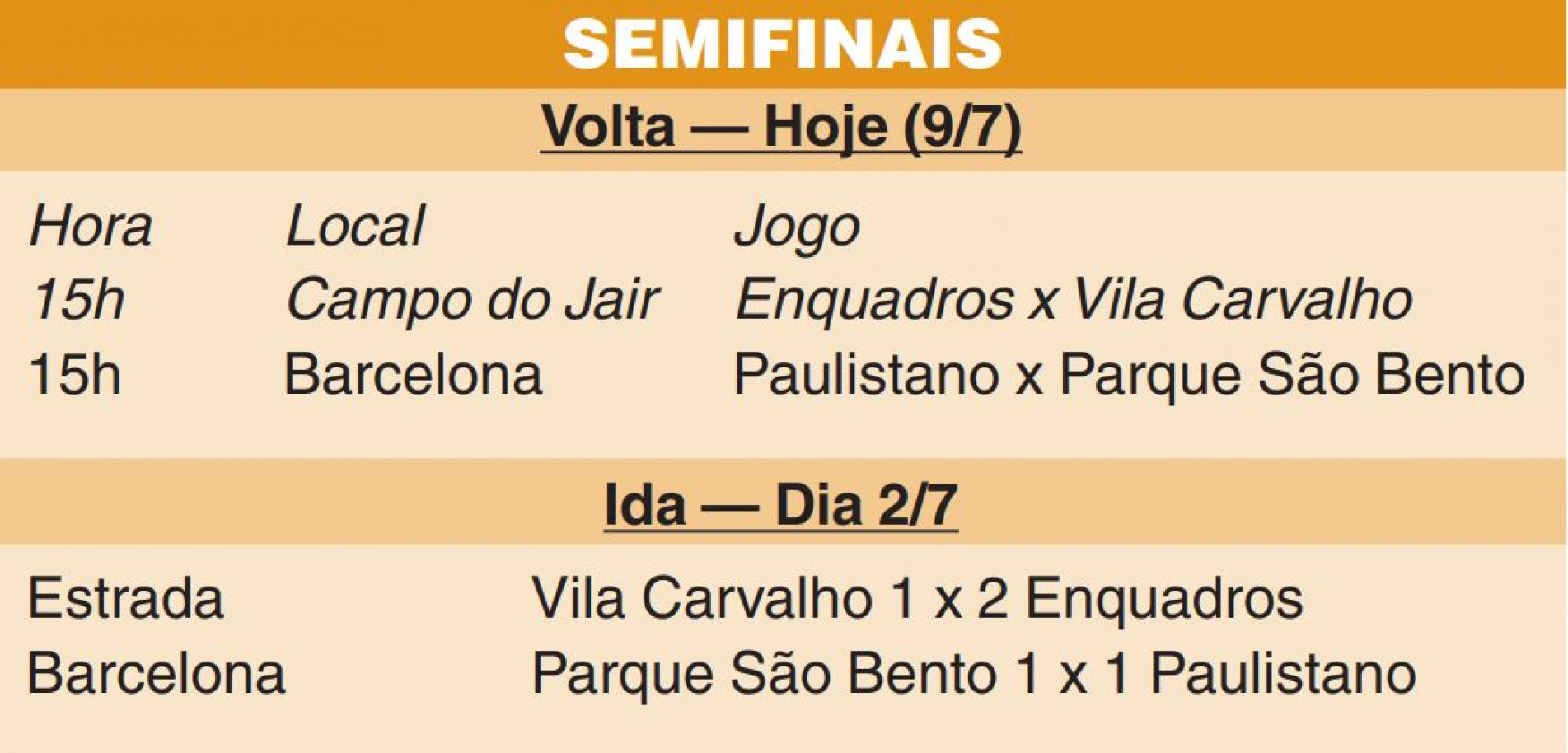 A outra semifinal, entre Parque São Bento e Paulistano, está aberta. Os times empataram por 1 a 1 no jogo de ida e uma nova igualdade por qualquer placar, de novo no Euzébio Moreno, levará a decisão do finalista para as cobranças de pênaltis. (Da Redação)