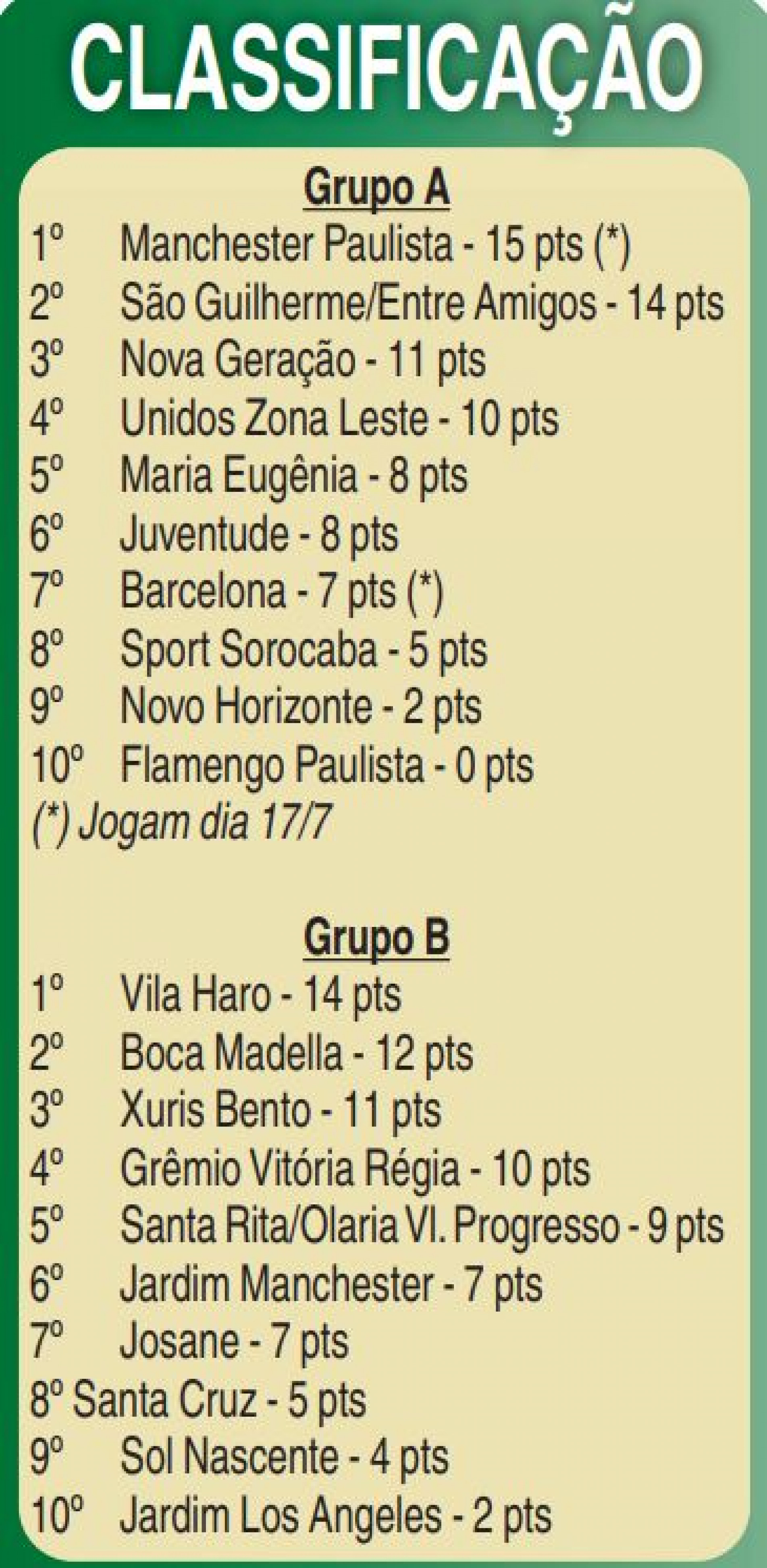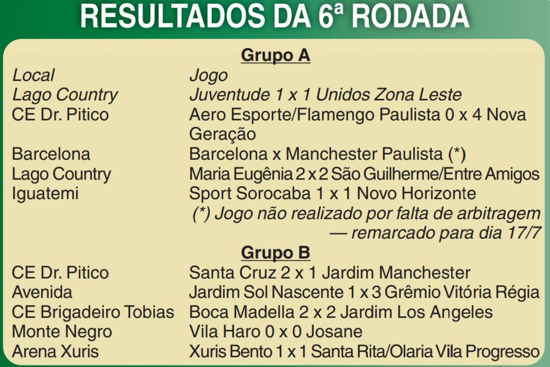 No Euzébio Moreno, também pelo Grupo A, o jogo entre Barcelona e Manchester Paulista não aconteceu por falta de um bandeirinha. A Sequav informou que já notificou a empresa de arbitragem contratada. Com isso, o jogo, válido pela sexta rodada, foi remarcado para o domingo (17), novamente às 10h30, no mesmo local. Com isso, a sétima rodada foi adiada para dia 24. (Da Redação)