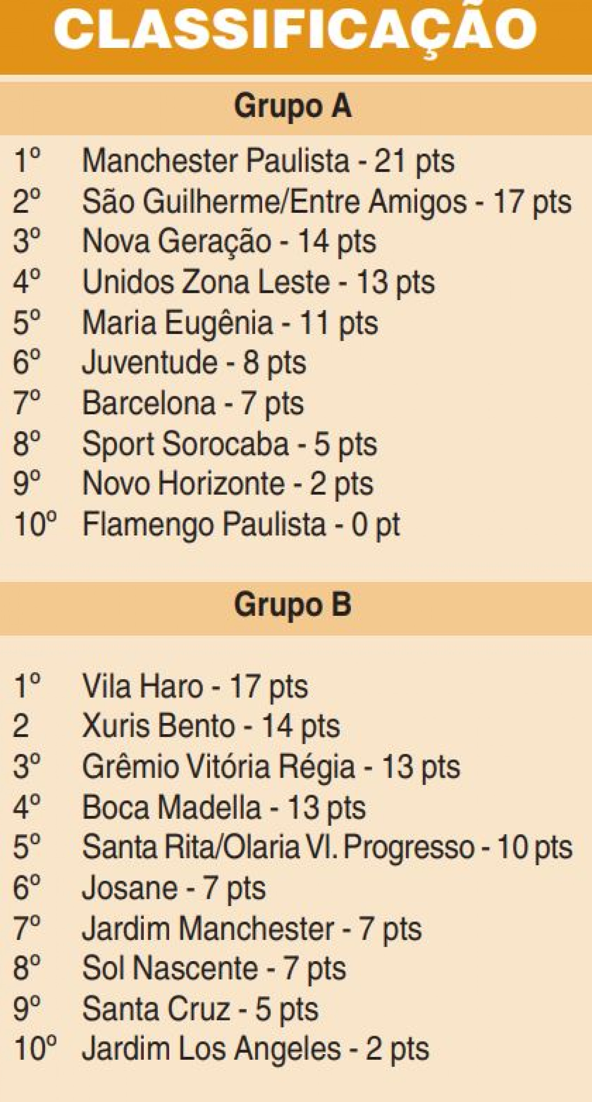 O Manchester Paulista segue na liderança do Grupo A, com 100% de aproveitamento, ao derrotar o Juventude por 3 a 0 no Rui Costa Rodrigues (Estrada). Pela mesma chave, o São Guilherme/Entre Amigos fez 6 a 1 no Aero Esporte/Flamengo Paulista, no CE Dr. Pitico, e o Maria Eugênia goleou o Novo Horizonte por 5 a 1 no Lago Country.