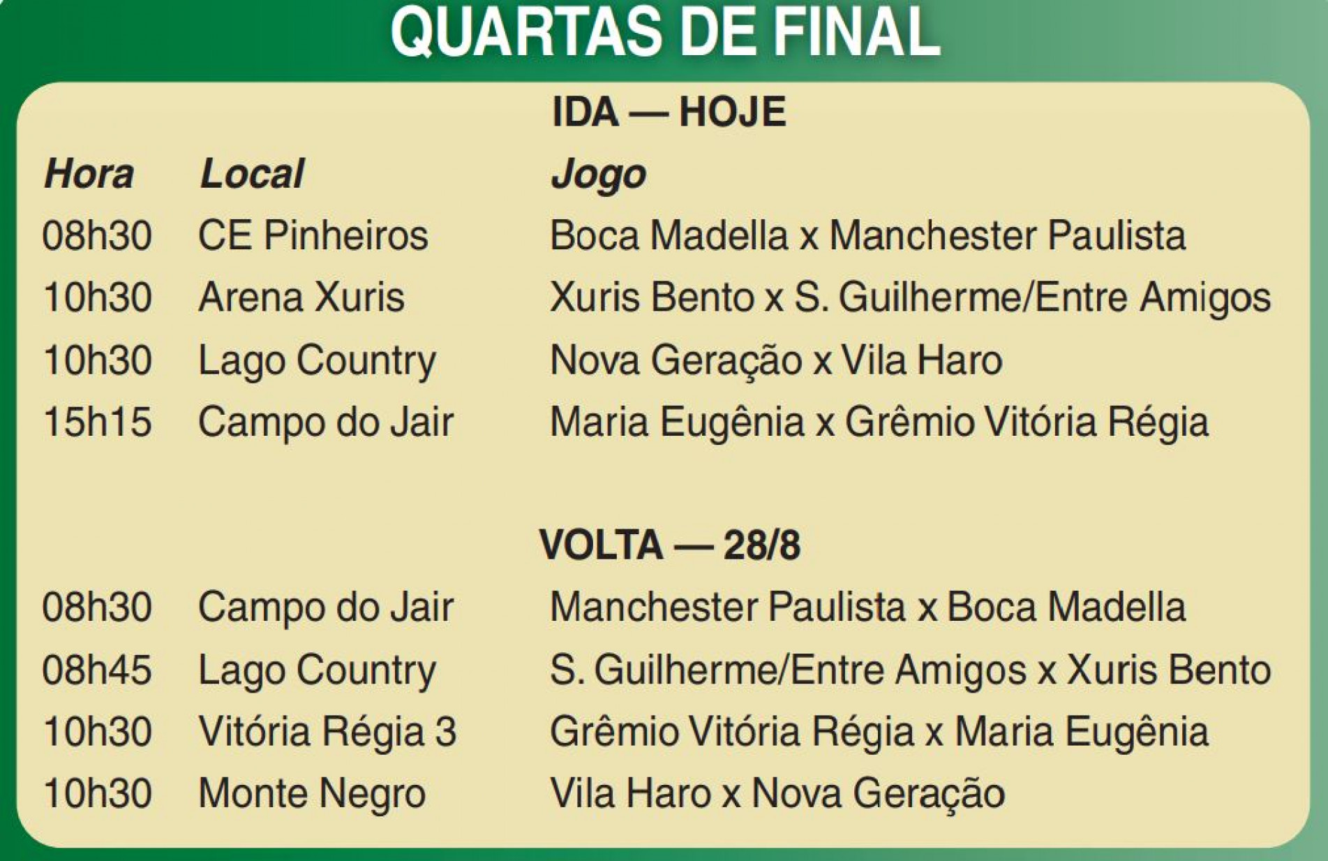 Outro invicto, o Vila Haro, que liderou o Grupo B na fase qualificatória, encara o Nova Geração às 10h30 no Lago Country. No mesmo horário, Xuris Bento e São Guilherme/Entre Amigos medem forças na Arena Xuris. Haverá um jogo à tarde, às 15h15, no Campo do Jair, entre Maria Eugênia e Grêmio Vitória Régia. (Da Redação)