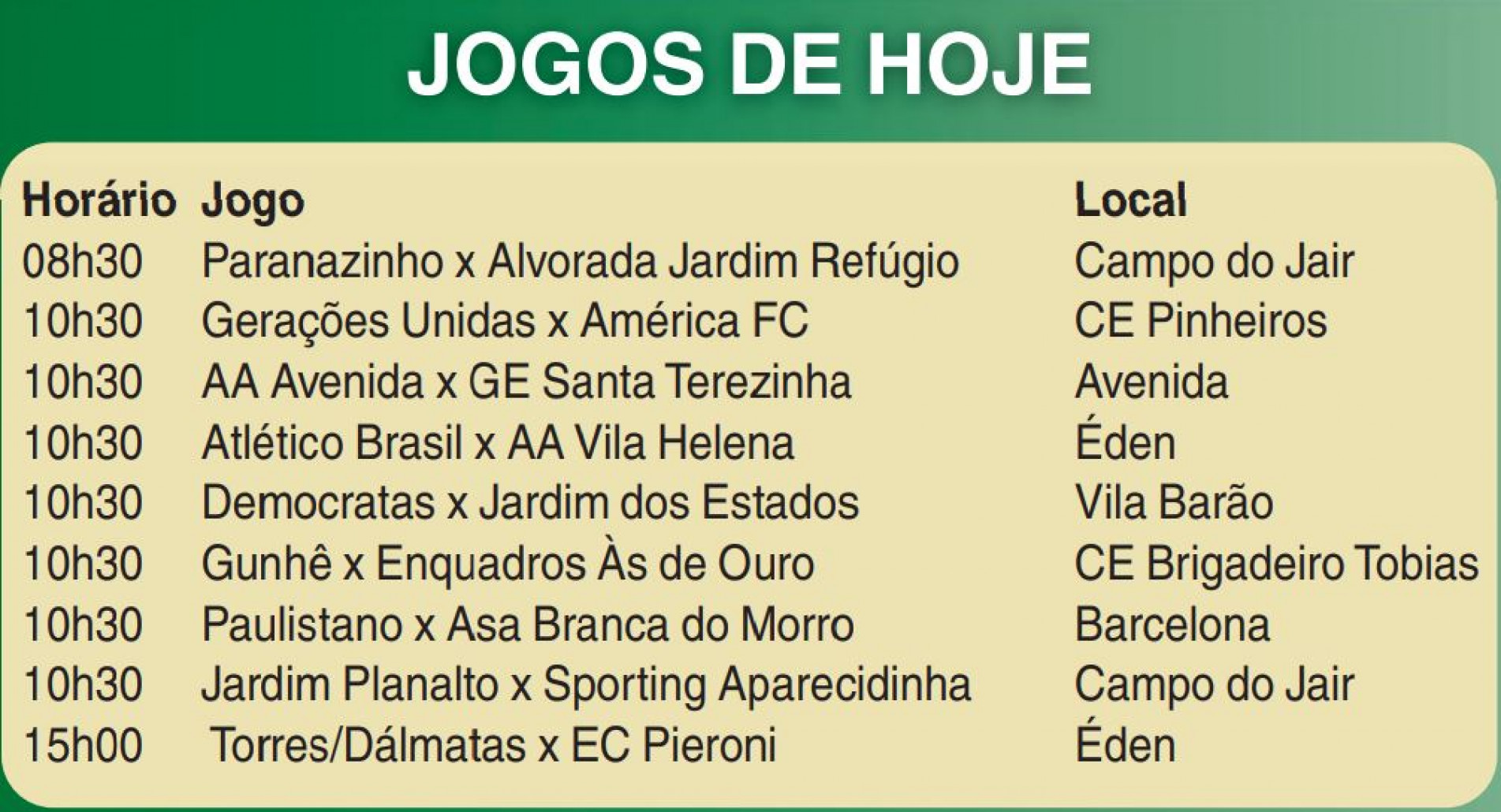 Líder do Grupo A, com duas vitórias e saldo de 9 gols nas duas primeiras rodadas, o Nova Esperança folga na rodada, uma vez que a chave tem apenas nove clubes. O vice-líder Vila Helena, que também tem 6 pontos, mas 7 gols de saldo, visita o Atlético Brasil, que ainda não pontuou, no Éden.