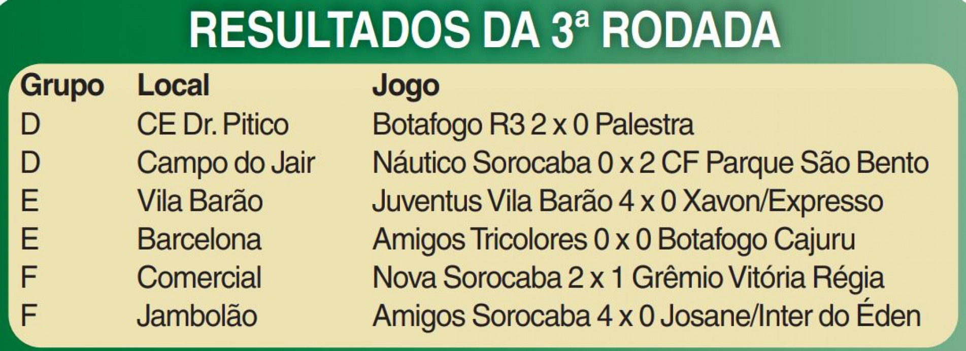 Seis jogos fecharam a terceira rodada da fase classificatória do Campeonato Municipal de Futebol Veterano da 2ª Divisão, no último sábado (3). Os destaques foram as goleadas por 4 a 0 do Juventus da Vila Varão sobre o Xavon/Expresso e do Amigos Sorocaba sobre o Josane/Internacional do Éden.