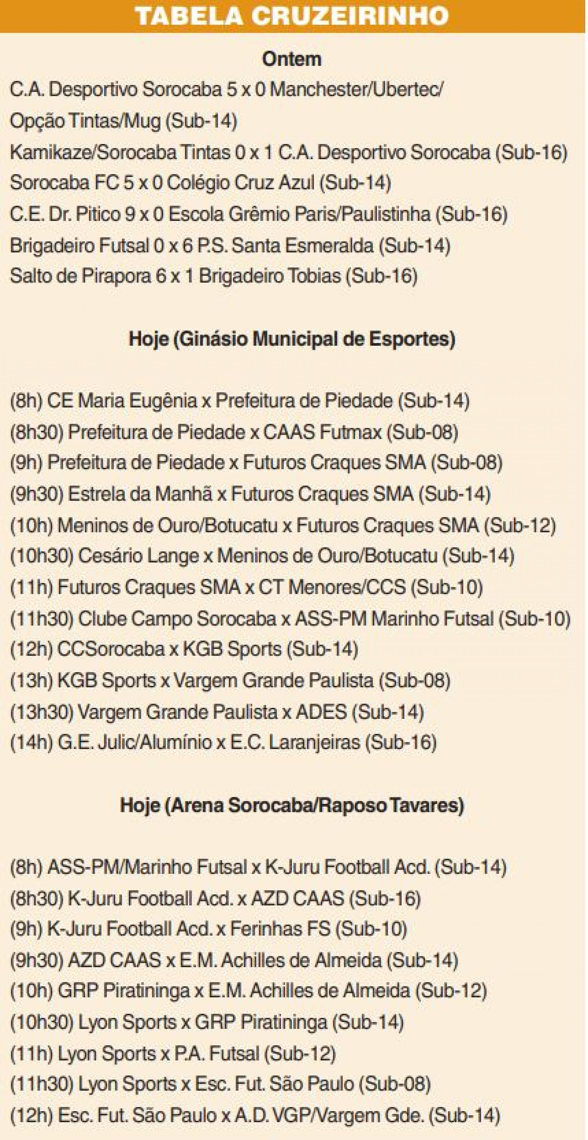 A primeira rodada da 42ª edição do torneio Cruzeirinho de Futsal/2022 teve 33 gols foram marcados, em seis partidas, média superior a cinco gols por jogo. Essas primeiras partidas foram disputadas ontem pela manhã, no Ginásio Municipal de Esportes Dr. Gualberto Moreira, em Sorocaba. A rodada inaugural continua hoje, novamente com jogos no Ginásio Municipal e na Arena Sorocaba, localizada na rodovia Raposo Tavares (ver tabela).