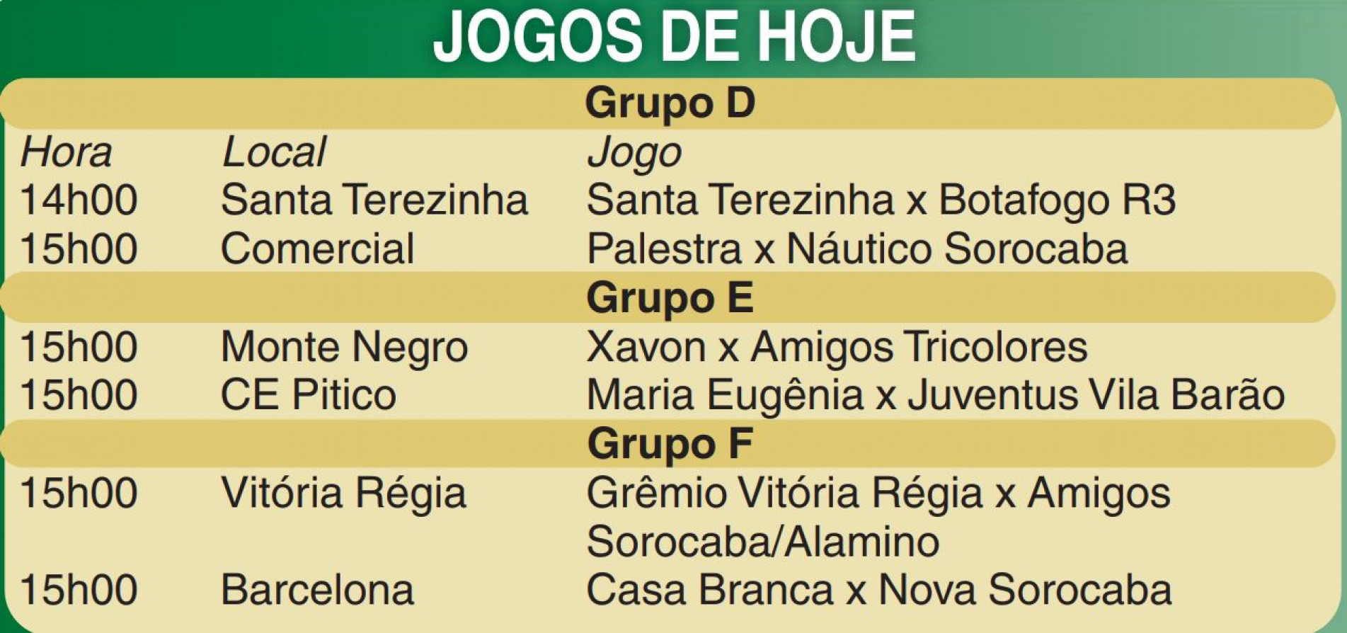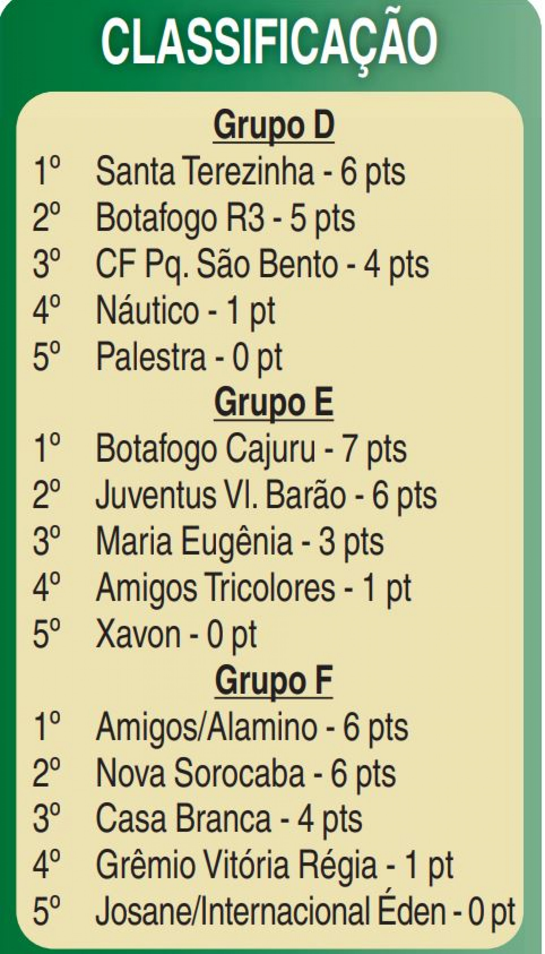 Seis partidas dão prosseguimento hoje (17) à quarta rodada do Campeonato Veterano da 2ª Divisão 2022. Há uma semana, foram a campo os times das chaves A, B e C. Desta vez, atuam as equipes dos grupos D, E e F. O Grupo D reserva um duelo entre líderes: Santa Terezinha x Botafogo R3, às 14h, no Santa Terezinha. Pelo Grupo E, como o Botafogo Cajuru folga, o Juventus Vila Barão pode assumir a ponta se vencer o Maria Eugênia às 15h no CE Pitico. E no Grupo F, o Grêmio Vitória Régia joga em casa e precisa vencer o líder Amigos Sorocaba/Alamino às 15h para continuar sonhando com a classificação à próxima fase.