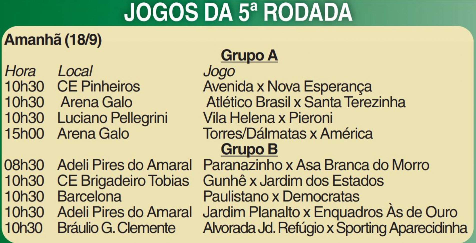 A Taça Cidade de Sorocaba, primeira divisão do campeonato municipal de futebol, chega amanhã à metade da fase de classificação. A quinta rodada terá nove jogos. Pelo Grupo A, os líderes Nova Esperança e Vila Helena encaram, respectivamente, Avenida e Pieroni, às 10h30, no CE Pinheiros e no Luciano Pellegrini. O Atlético Brasil busca se afastar da degola recebendo o Santa Terezinha às 10h30 na Arena Galo, palco do único jogo da tarde: às 15h, o América tenta entrar na zona de classificação desafiando o Torres/Dálmatas.
