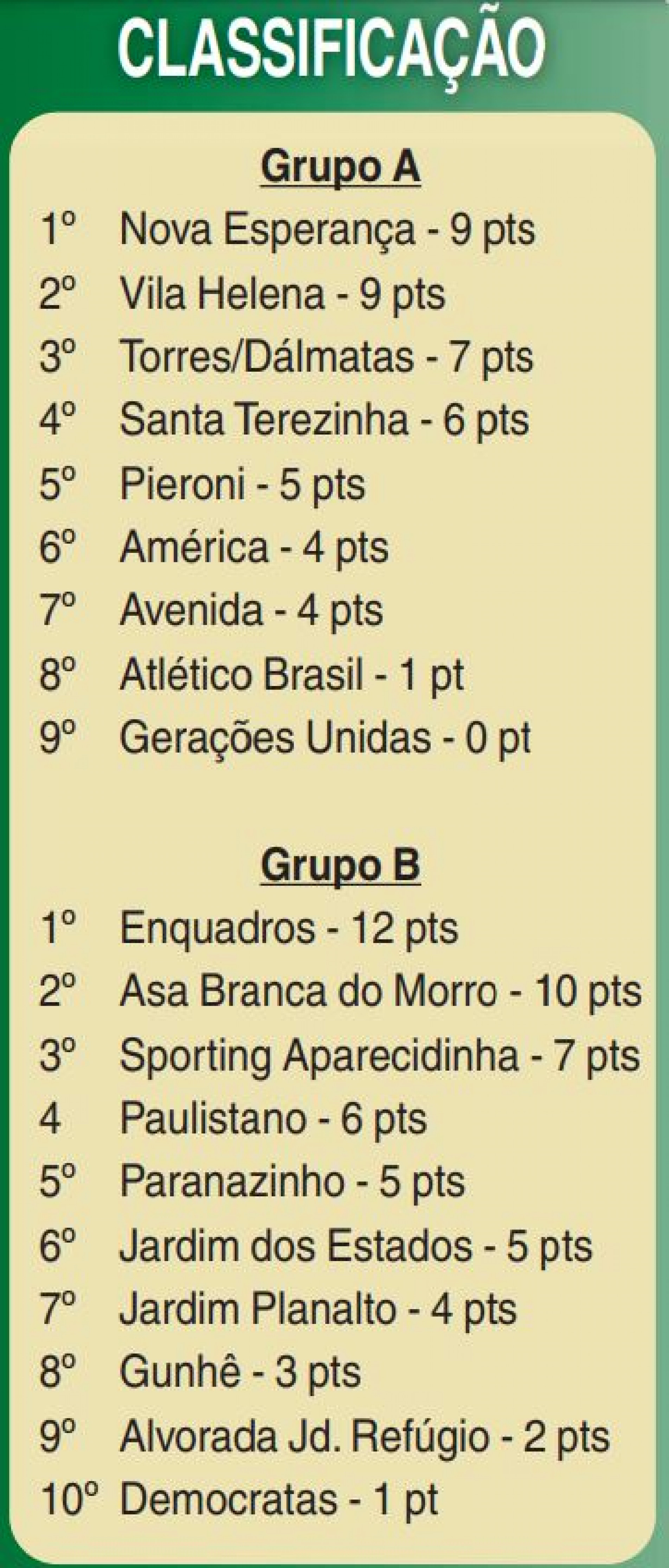No Grupo B, o Enquadros defende a última campanha com 100% de aproveitamento diante do Jardim Planalto, às 10h30, no Adeli Pires do Amaral, que recebe rodada dupla: antes, às 8h30, o vice-líder Asa Branca do Morro mede forças com o Paranazinho. Também às 10h30, o Alvorada Jardim Refúgio espera deixar a parte de baixo da tabela desafiando o Sporting Aparecidinha, terceiro melhor da chave, no Bráulio Clemente. Gunhê e Jardim dos Estados fazem confronto direto no CE Brigadeiro Tobias e o Democratas quer deixar a lanterna contra o Paulistano, no Barcelona. (Da Redação)