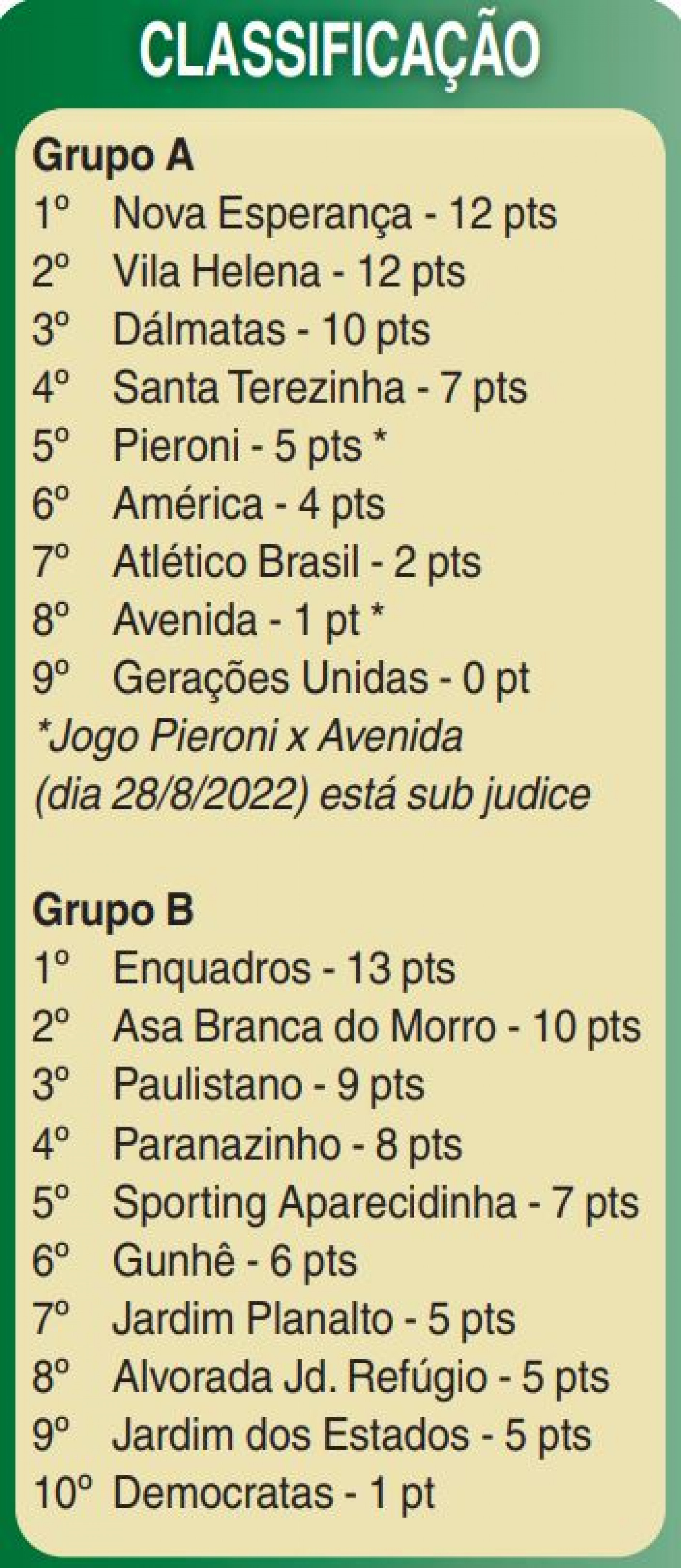 No Grupo B, o Enquadros, último time que tinha 100% de aproveitamento, perdeu os primeiros pontos, ao empatar sem gols com o Jardim Planalto no Adeli Pires do Amaral e ir a 13. Pelo Grupo A, os líderes Nova Esperança e Vila Helena vencaram, respectivamente, Avenida (1 a 0) e Pieroni (3 a 0), no CE Pinheiros e no Luciano Pellegrini, e seguem empatados, agora com 12 pontos. (Da Redação)