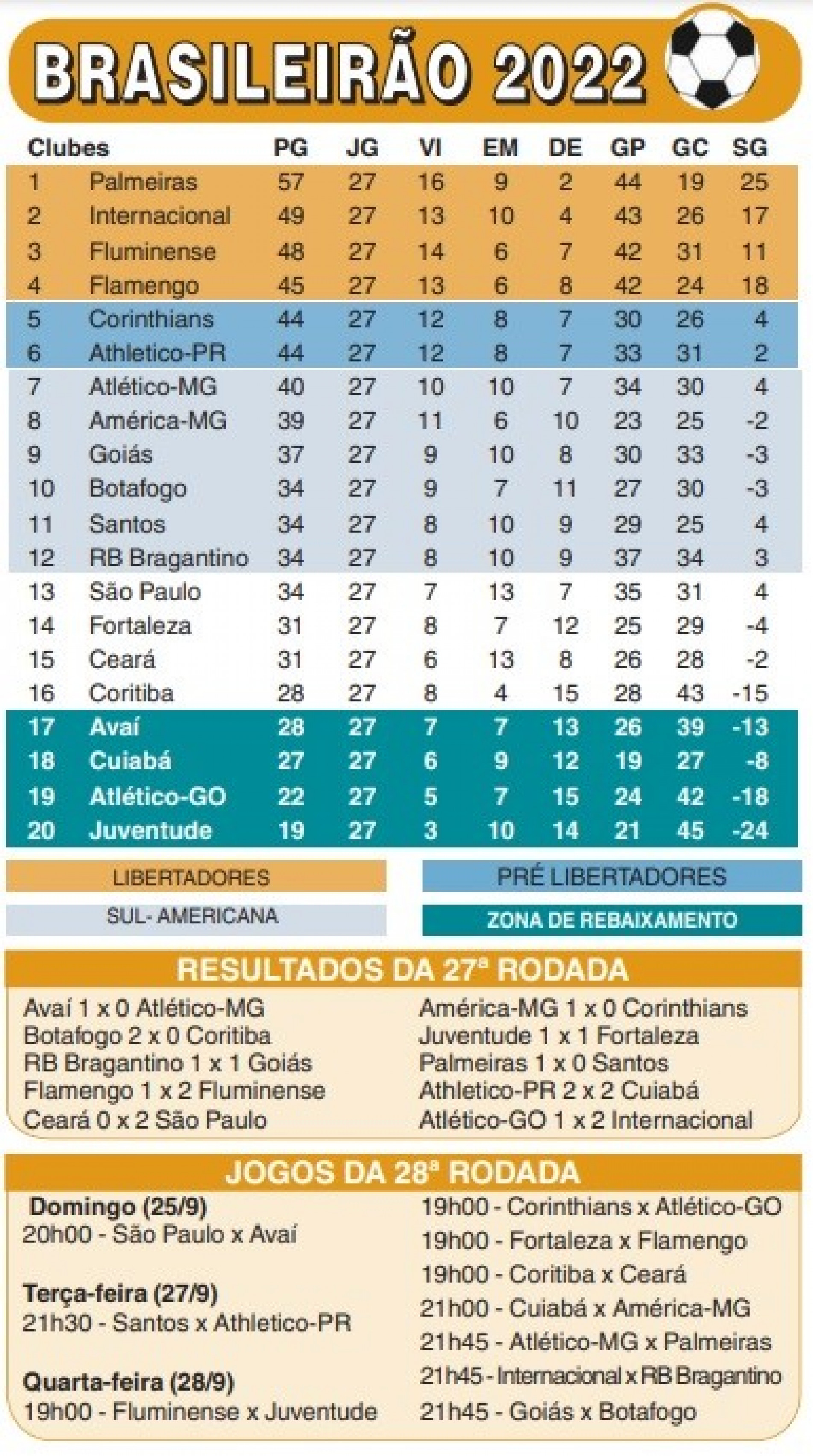 Os dados são do Departamento de Matemática da Universidade Federal de Minas Gerais (UFMG). A equipe palestrina lidera o campeonato com 57 pontos, oito a mais que o Internacional e nove à frente do Fluminense.