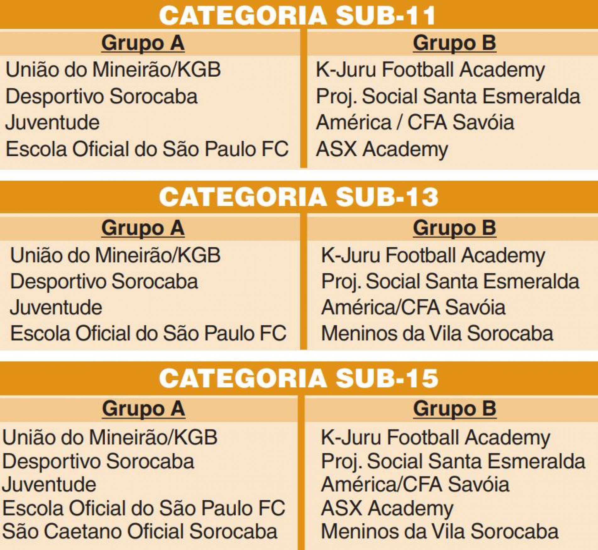 O campeonato terá início no dia 8 de outubro e contará com 10 times nas categorias sub-11 (atletas nascidos em 2011 e 2012), sub-13 (nascidos em 2009 e 2010) e sub-15 (nascidos em 2007 e 2008). (Da Redação)