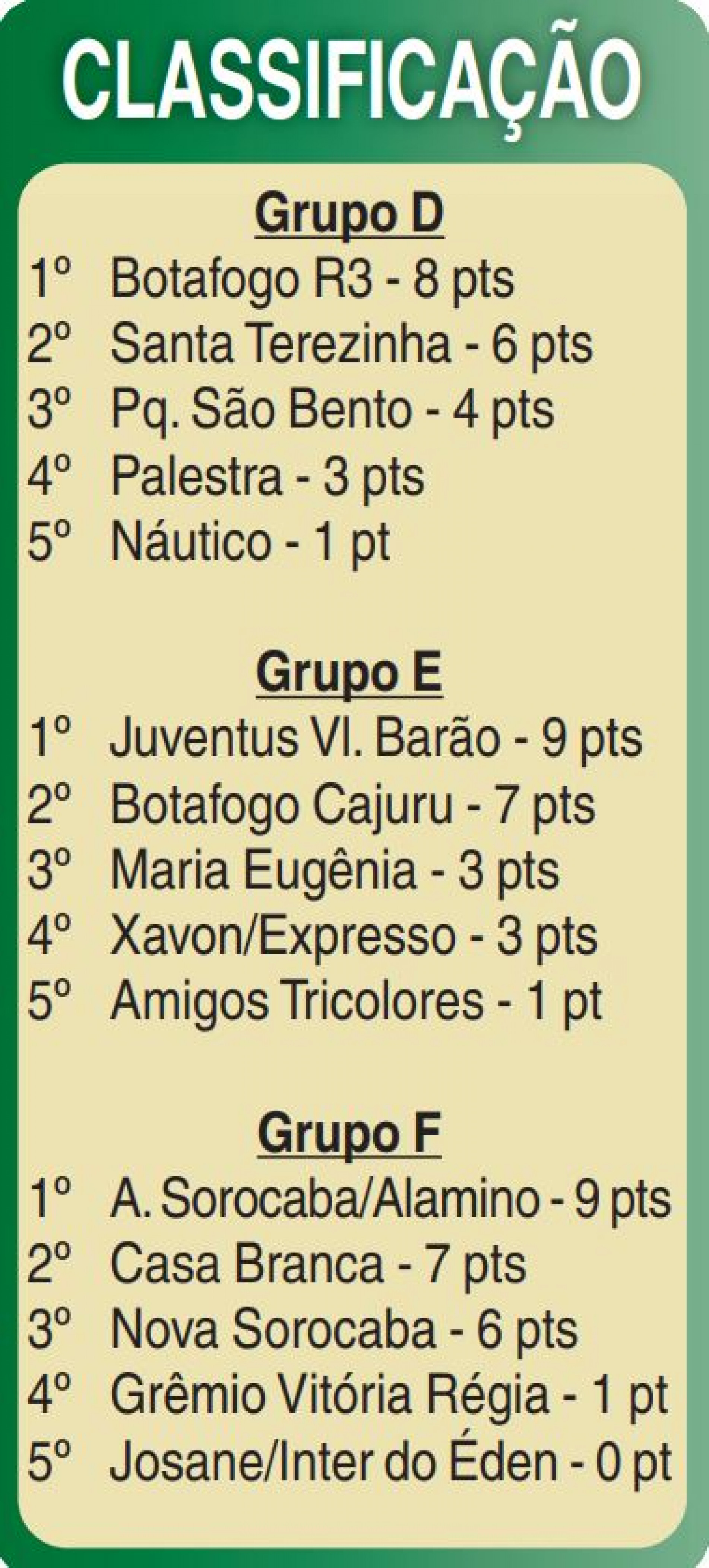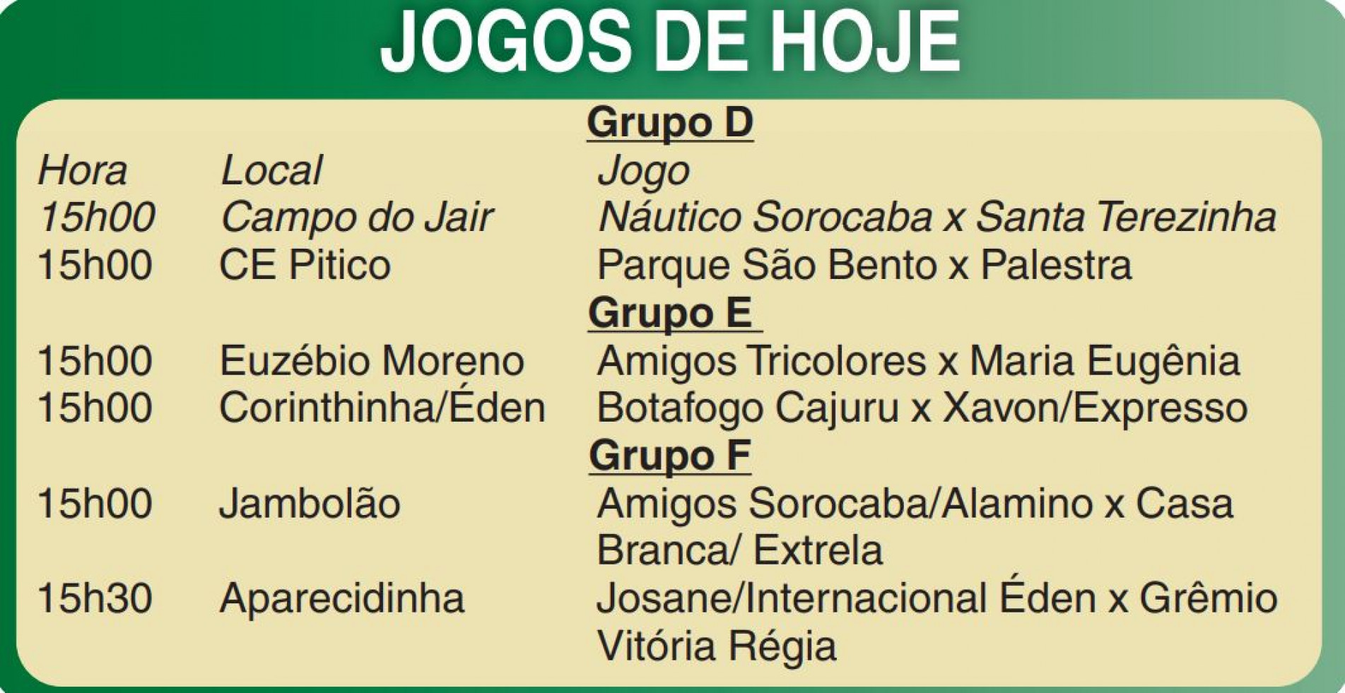 No Grupo D, o Santa Terezinha precisa de um empate contra o Náutico Sorocaba para confirmar a vice-liderança e a vaga. Parque São Bento e Palestra jogam de olho em um lugar entre os melhores terceiros colocados -- assim como Maria Eugênia e Xavon/Expresso, no Grupo E, adversários de Amigos Tricolores e Botafogo Cajuru. Pelo Grupo F, como o Nova Sorocaba folga, o Casa Branca/Extrela avança em segundo mesmo se perder do Amigos Sorocaba/Alamino. (Da Redação)