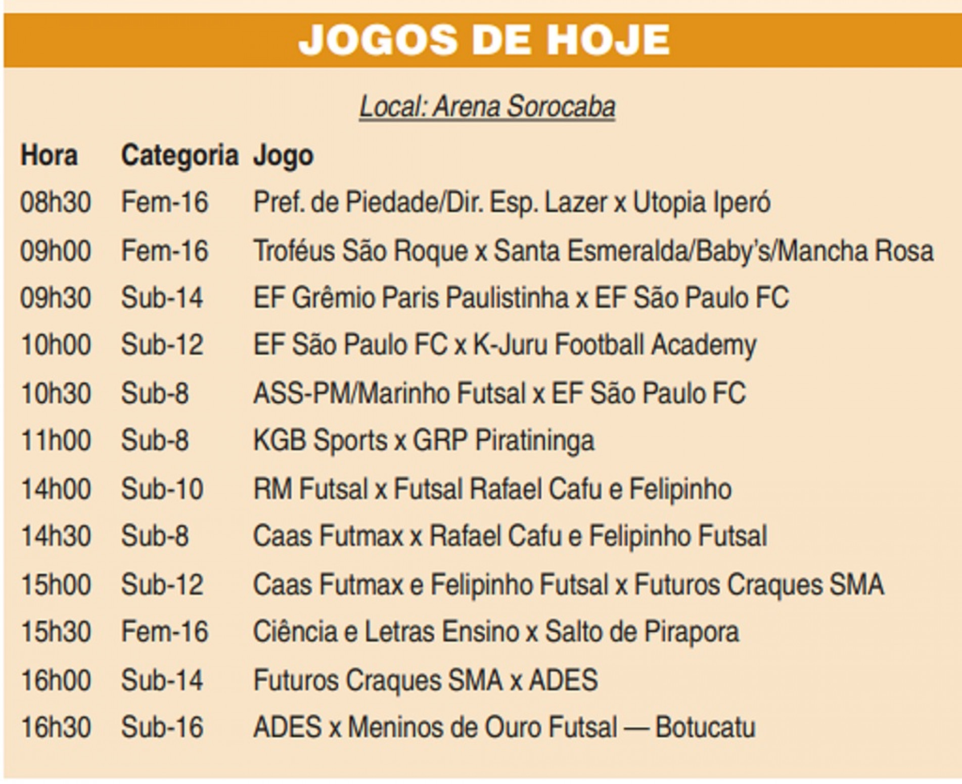 A bola vai rolar neste domingo (16), na Arena Sorocaba, para as 12 partidas da quinta semana do 42º Torneio Aberto de Futsal para Crianças e Adolescentes, o Cruzeirinho 2022, a partir das 8h30. O objetivo do torneio é promover intercâmbio esportivo entre crianças e adolescentes de Sorocaba e região, bem como integrar, socializar e otimizar a participação deles, estimulando a prática do futsal e promovendo a melhoria da qualidade de vida.