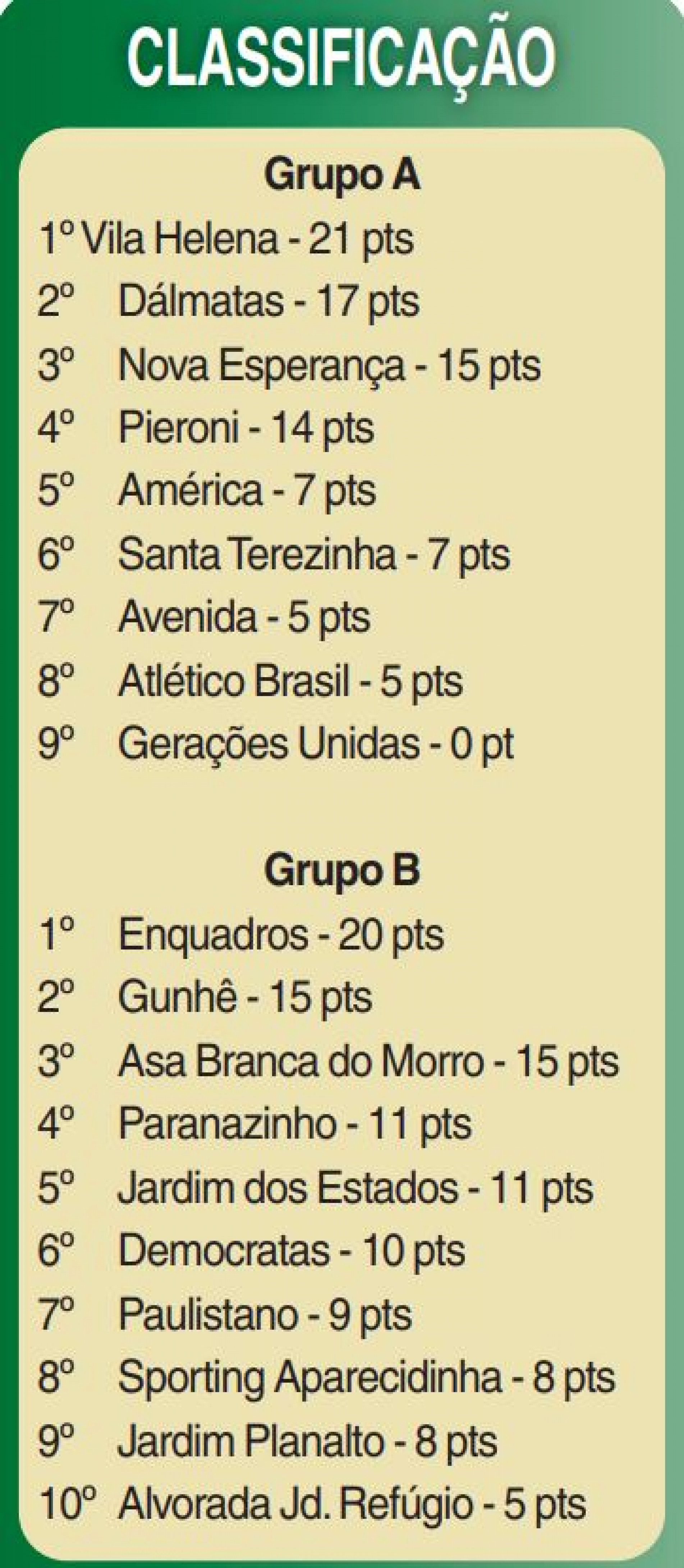 Com nove jogos, termina hoje (22) a fase classificatória da Taça Cidade de Sorocaba, a divisão de elite do campeonato municipal de futebol. A bola rola para todos os confrontos às 10h30. Há apenas uma vaga às oitavas em disputa, entre Paranazinho, Jardim dos Estados e Democratas, no Grupo B. O Paranazinho é o único que depende dele mesmo: basta vencer o já classificado Gunhê na Arena Aparecidinha. Enquadros e Asa Branca do Morro também avançaram antecipadamente. O Grupo A já definiu os quatro classificados: Vila Helena, Dálmatas, Nova Esperança e Pieroni.